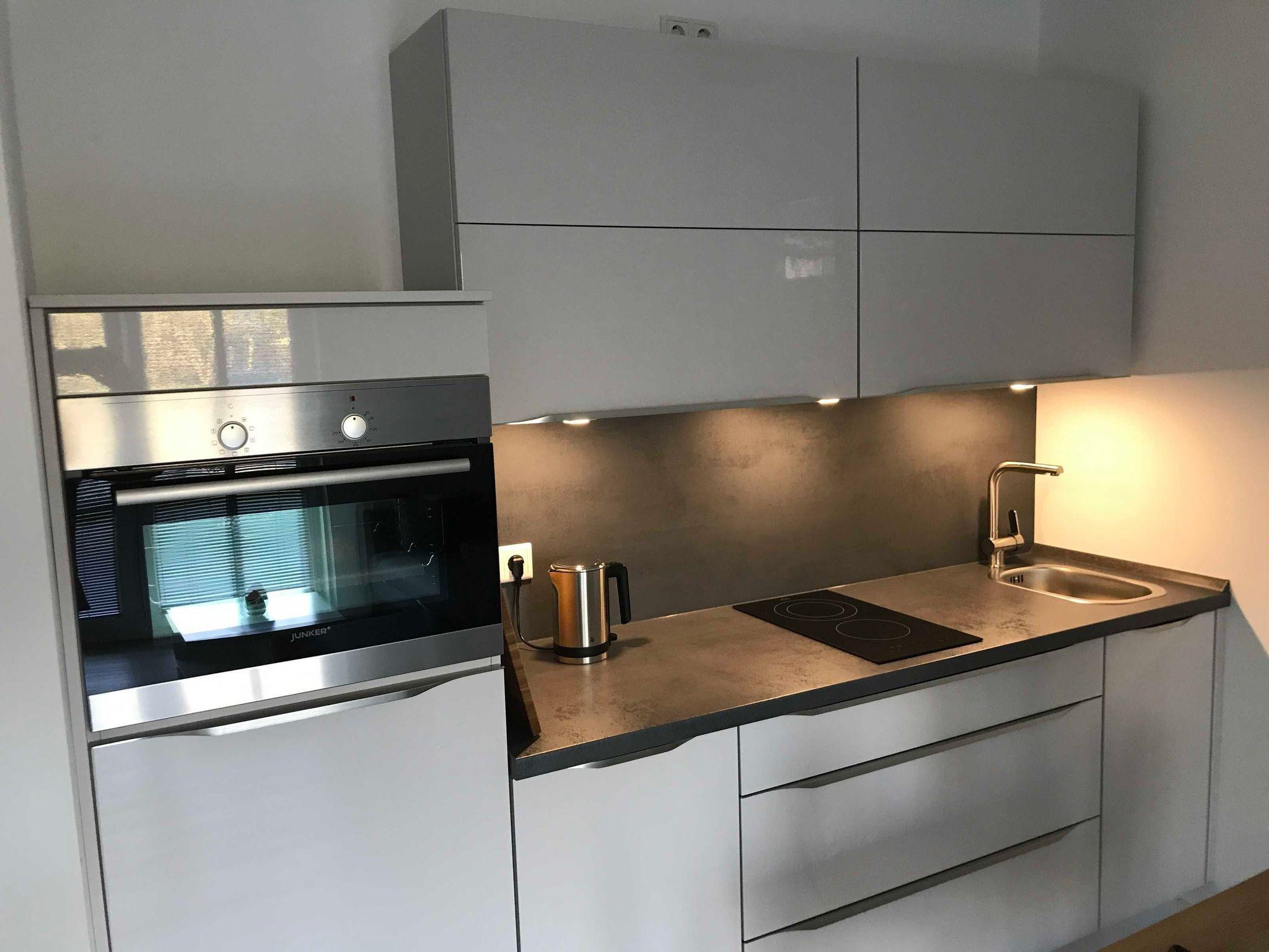 40 m² 2-Raum-Wohnung, Ausgang zur Sonnenterrasse von Wohnzimmer und Schlafraum. Offener Wohn-/Kochbereich mit Esstisch und Einbauküche mit vielen Extras.