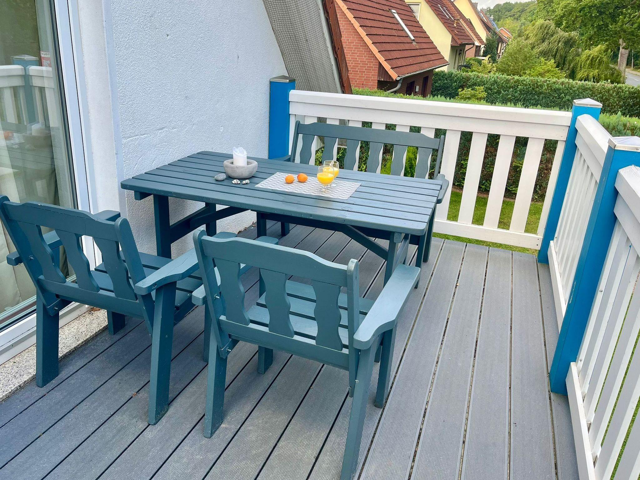 Der große Balkon mit Sitzmöbeln bietet zusätzlichen Platz zum Entspannen.