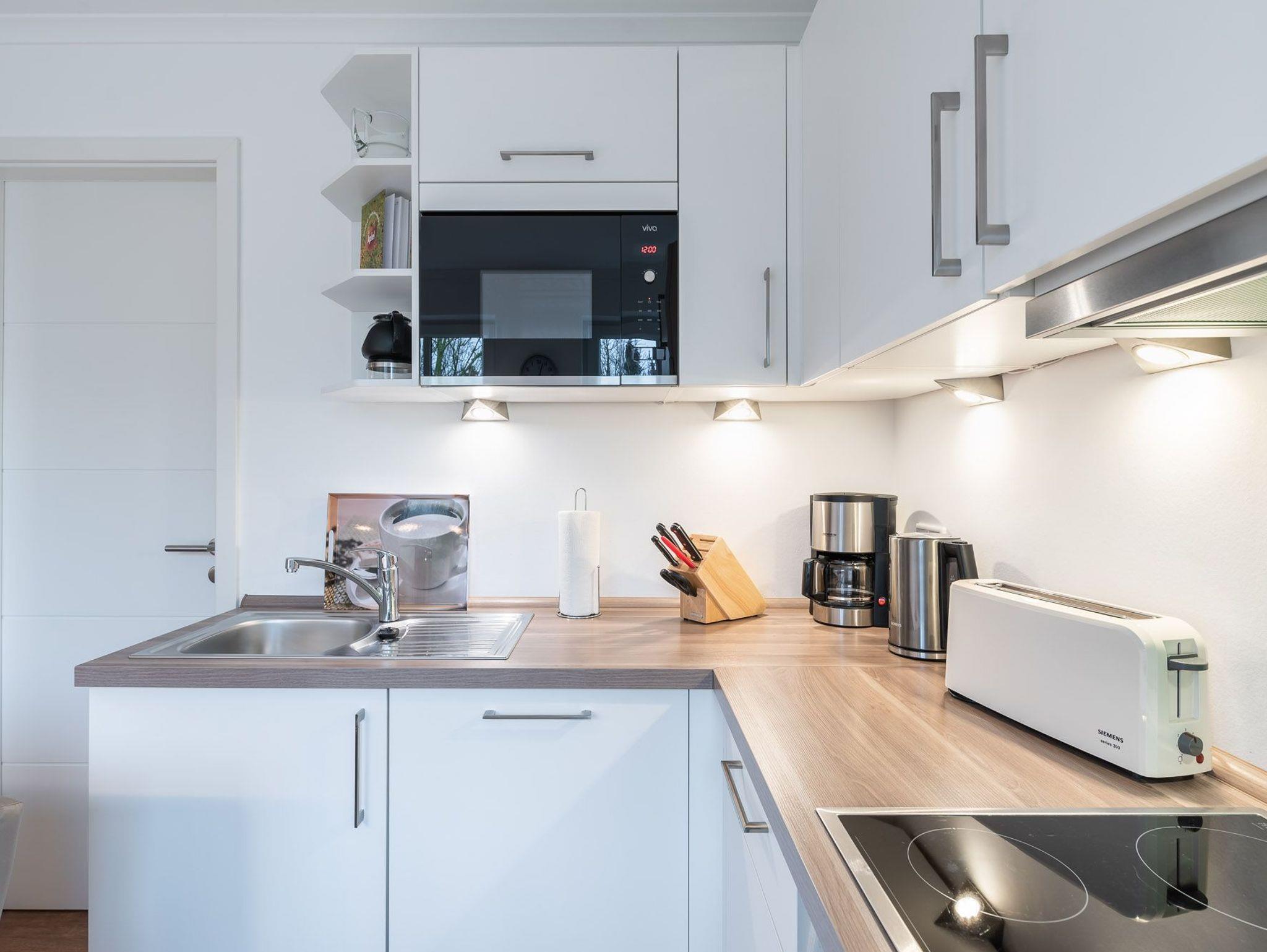Die Küche ist ausgestattet mit einer hochwertigen Einbauküche, einem Esstisch und vier Stühlen, Geschirrspüler, Kühlschrank mit Gefrierfach, Kaffeemaschine, Wasserkocher, Toaster, Mixer, ausreichend Geschirr und Besteck, 4-Platten-Herd (Ceran) mit Backofen und einer Mikrowelle.