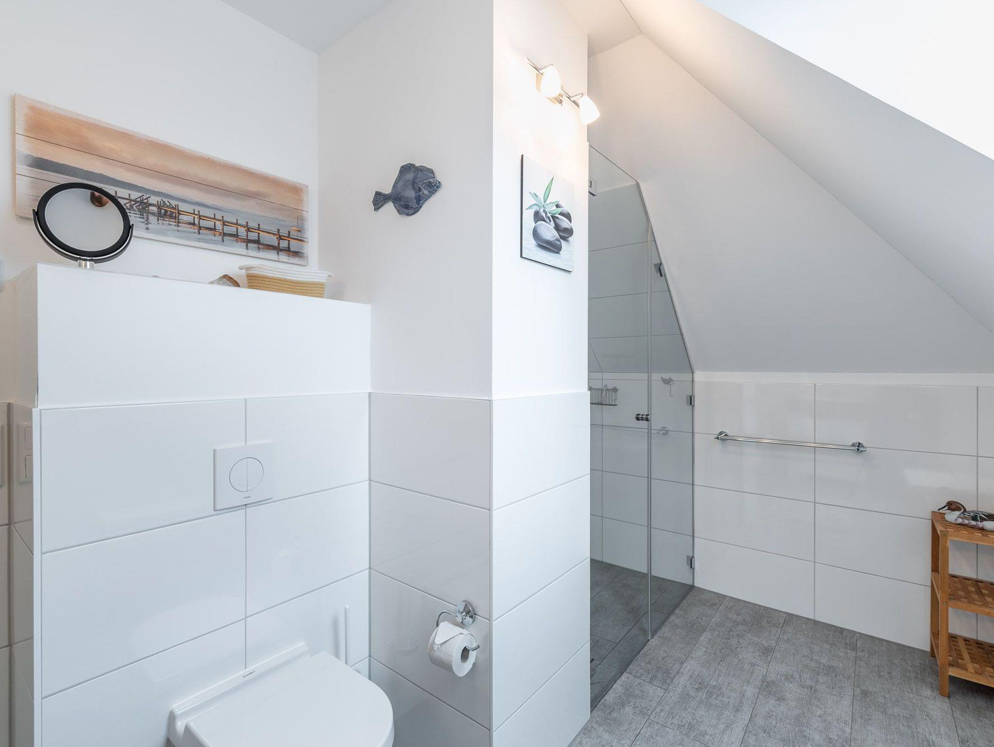Das Bad mit Tageslicht verfügt über eine großzügige und ebenerdige Dusche, ein Fön ist vorhanden.
