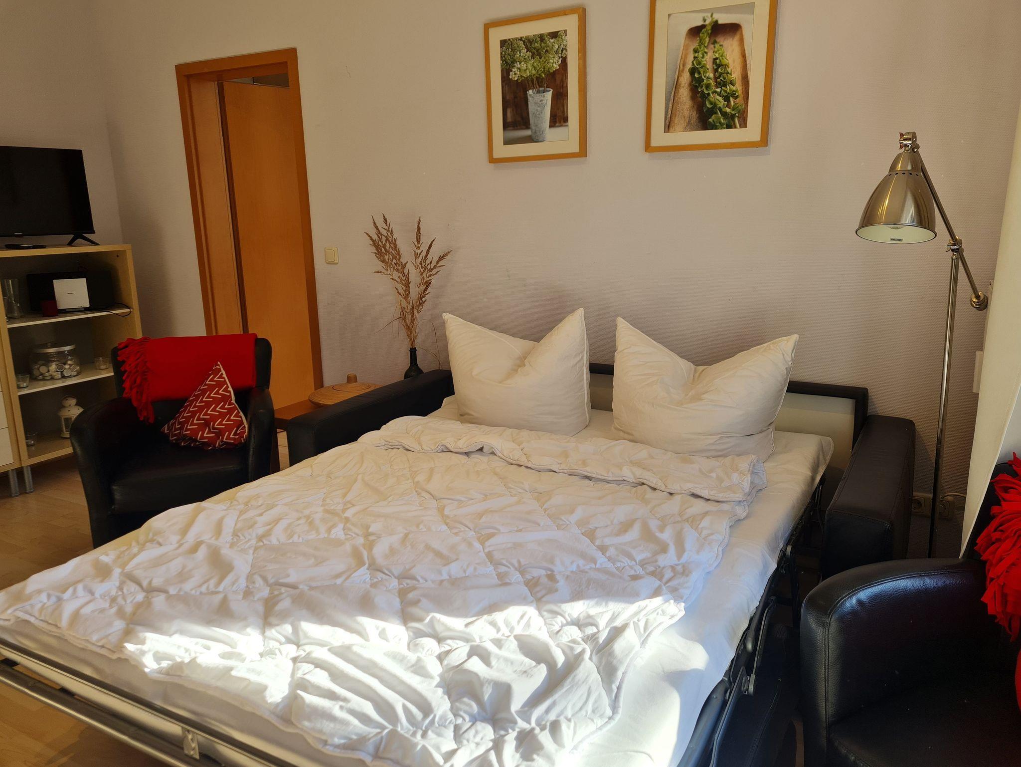 • Wohnzimmer: gemütliche Schlafcouch aus Leder 140x200cm mit Matratze, Flachbild-TV, Sideboard, 2 Sessel, Tisch, Radio mit CD und Bluetooth, Leselampe