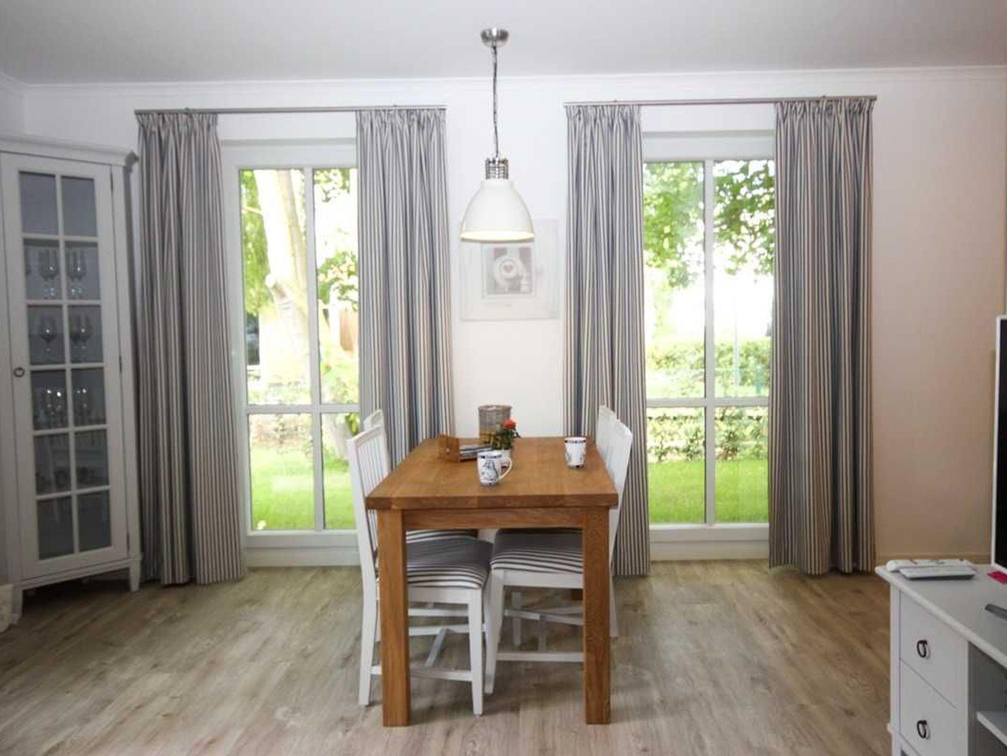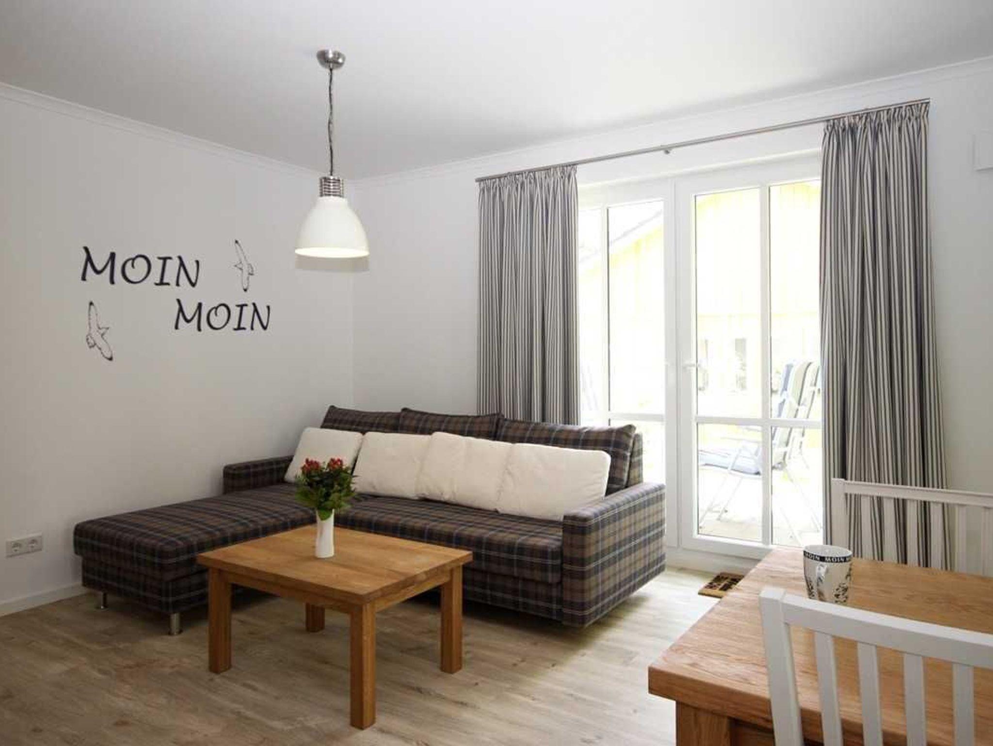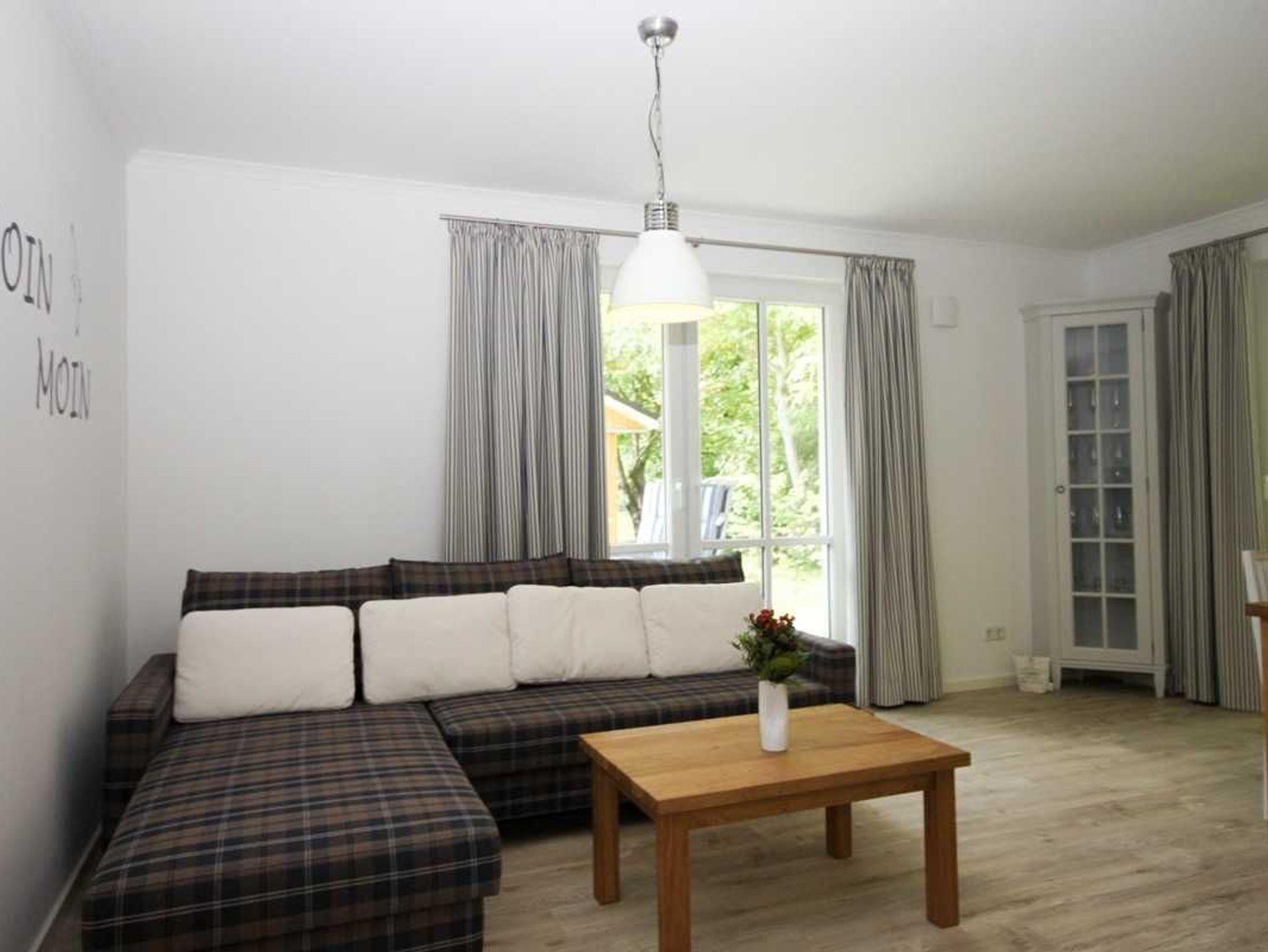 Der Wohn- und Essbereich verfügt über eine große und gemütliche Couch (mit Schlaffunktion), einen Couchtisch, sowie einen Esstisch mit vier Stühlen. Ein Flat-Screen-TV (48 Zoll), Blu-Ray-Player und eine kleine Stereoanlage gehören ebenfalls zur Ausstattung. An kühlen Herbst- und Wintertagen sorgt in allen Räumen eine Fußbodenheizung für Wärme und Gemütlichkeit.