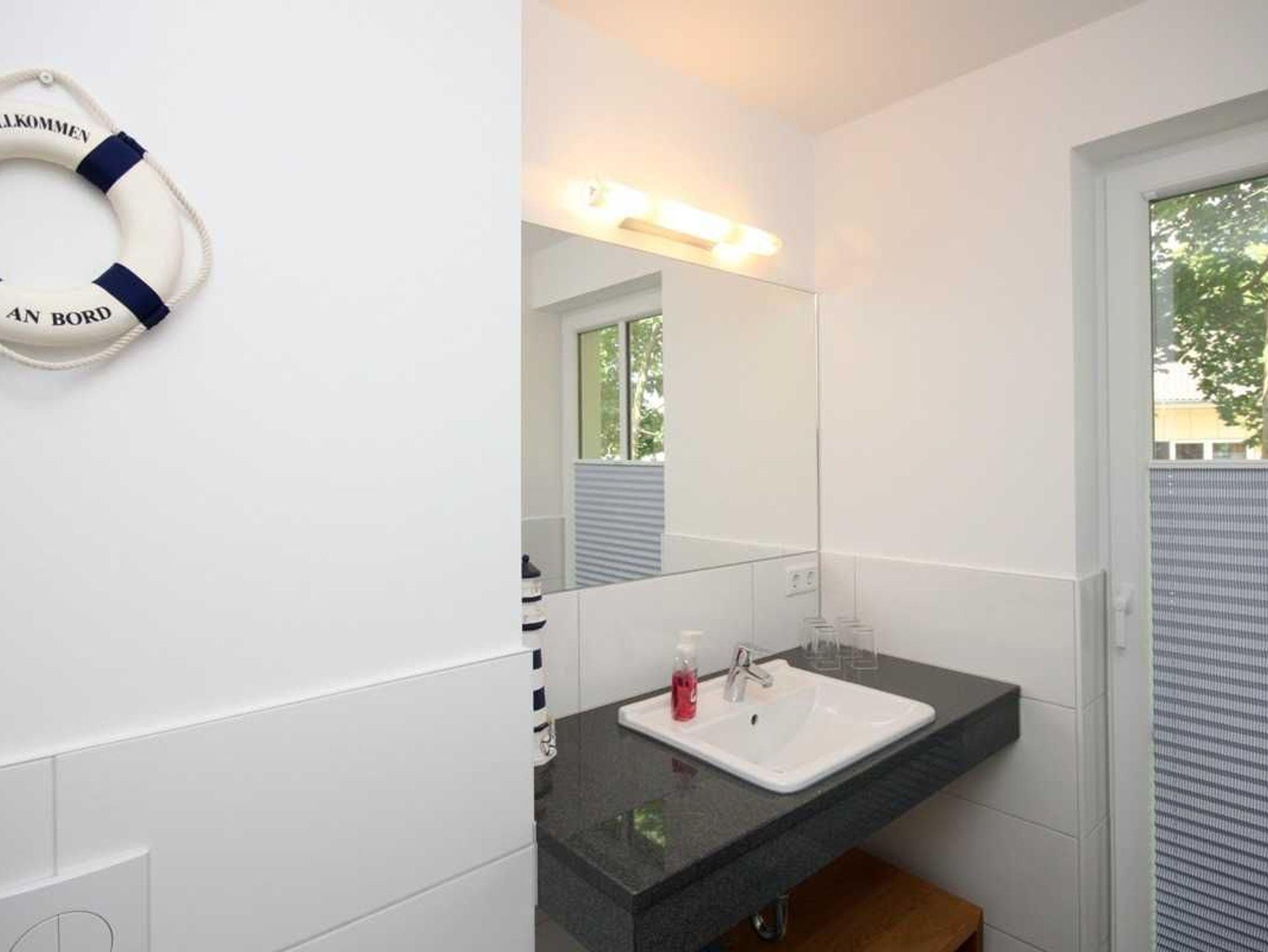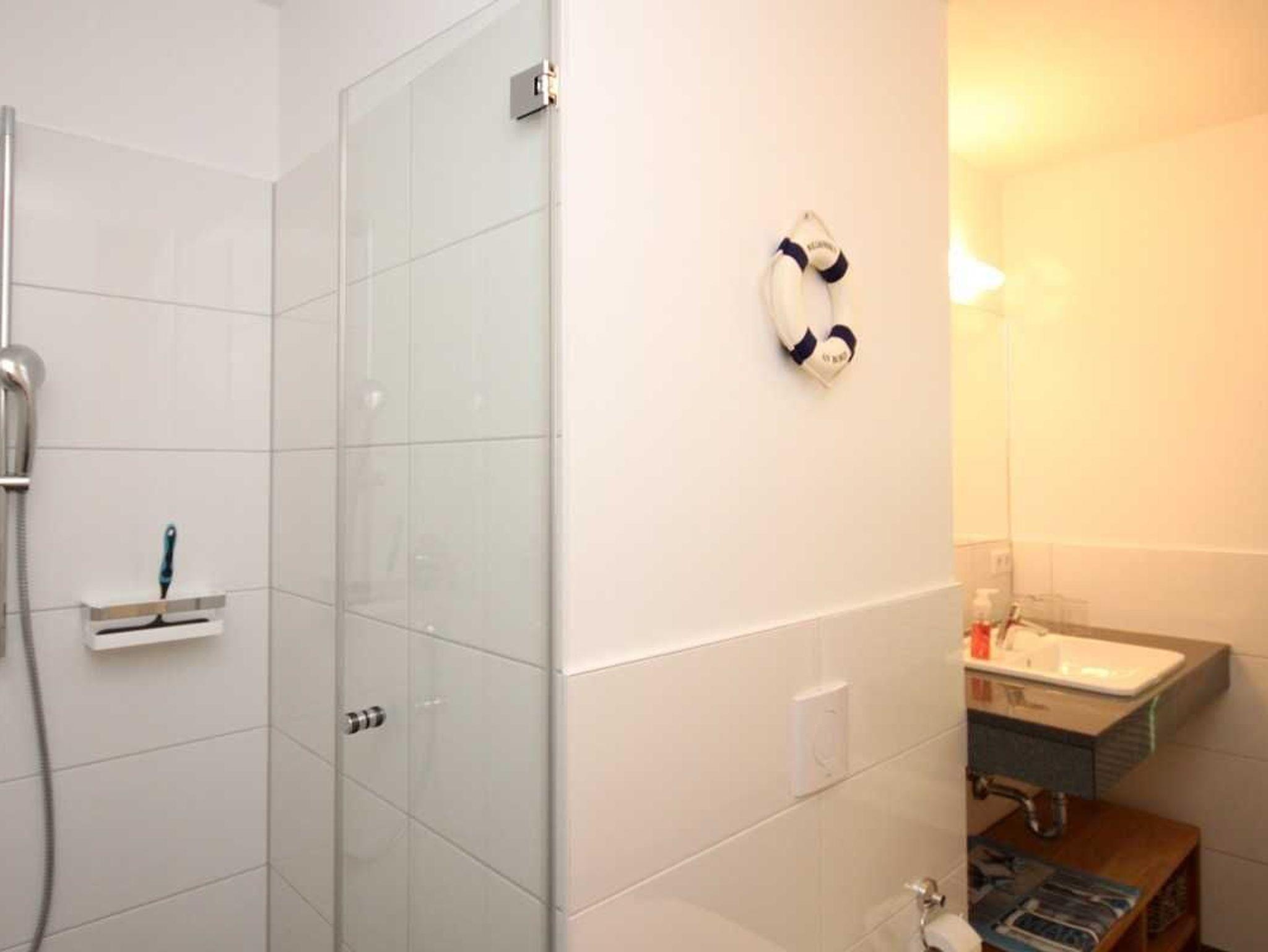 Das Badezimmer ist mit einer bodengleichen begehbaren Dusche, einem großen Waschtisch, einem Wandspiegel und einem Fön ausgestattet.