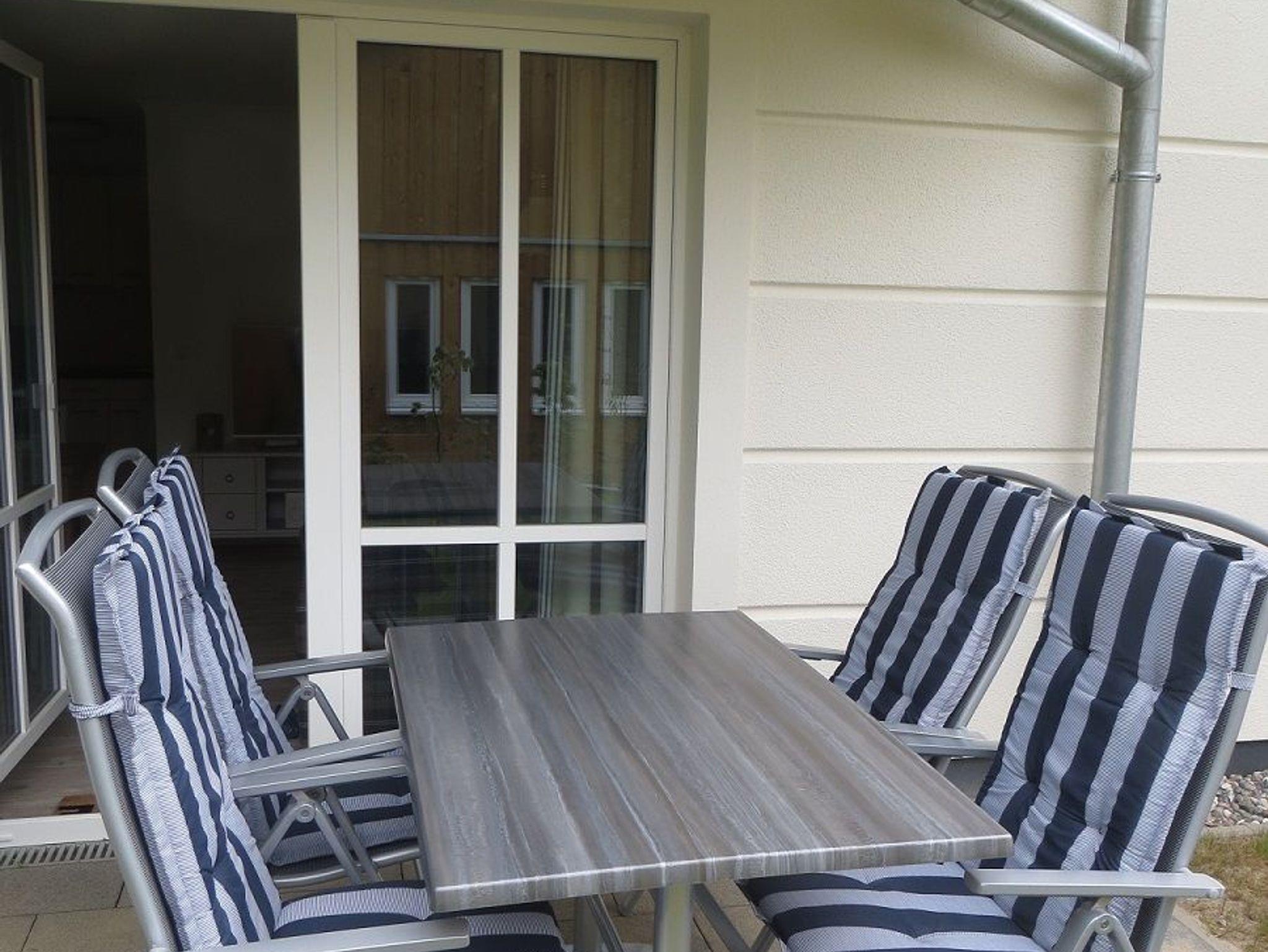 Vom Wohnbereich aus haben Sie Zugang zut Terrasse. Die Terrasse ist ausgestattet mit einem Tisch und vier Stühlen für gemütliche Stunden während Ihres Urlaubs.