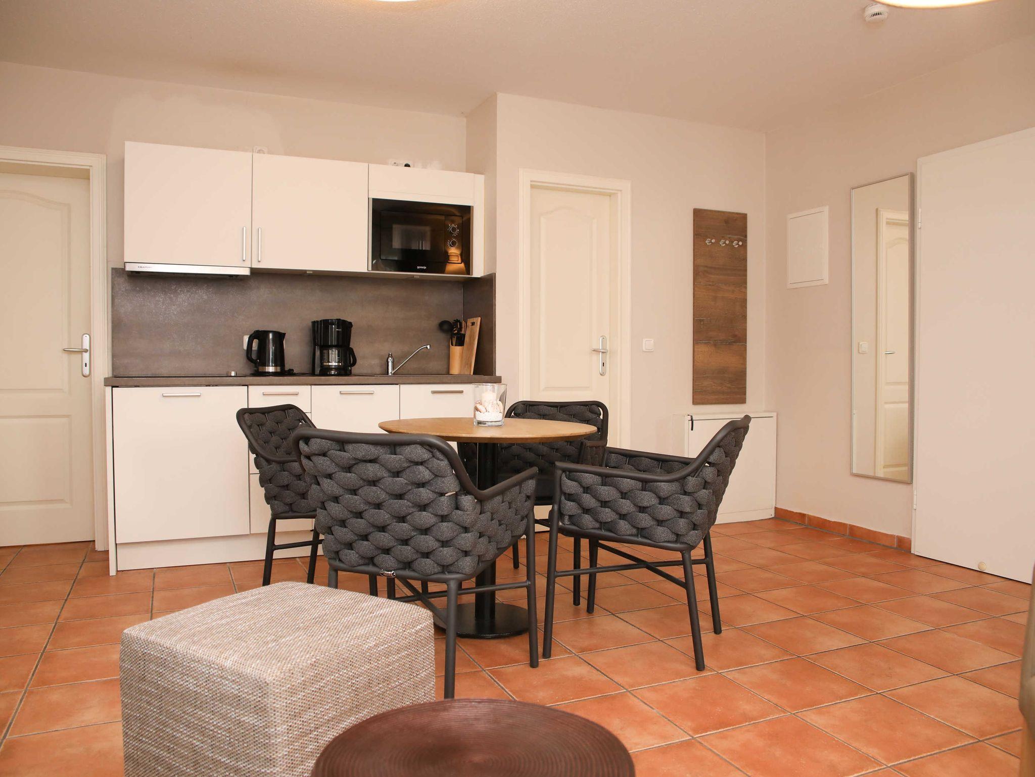 Die Ferienwohnungen bestehen aus 2 Zimmern und sind ca. 45 m² groß. Die Ferienwohnungen verfügen über Balkon oder Terrasse, ein Schlafzimmer mit Doppelbett, ein Vollbad mit Wanne und Dusche, WC, eine komplett hochwertig ausgestattete Einbauküche und ein Doppelschlafsofa im Wohnbereich, sowie Flachbildfernseher. Alle Wohnungen sind komplett mit einer Fußbodenheizung ausgestattet.