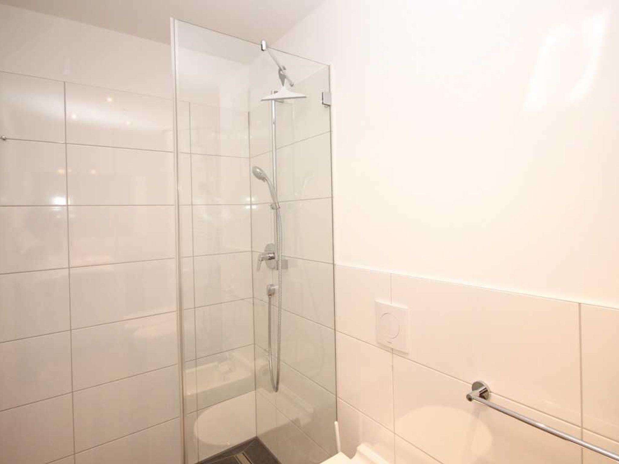 Die Wohnung hat ein Schlafzimmer, einen offenen Wohn-Küchenbereich und ein Badezimmer mit ebenerdiger Regendusche.