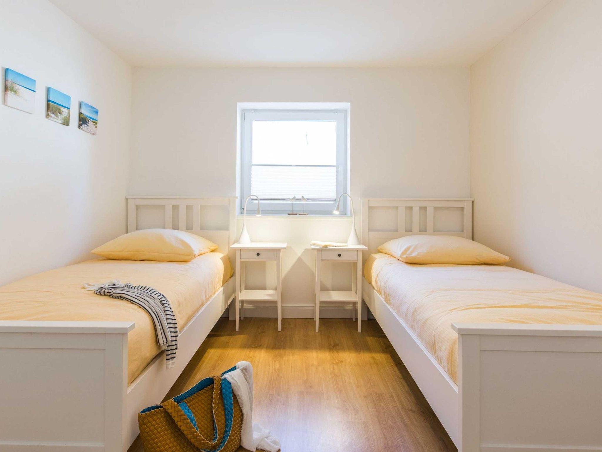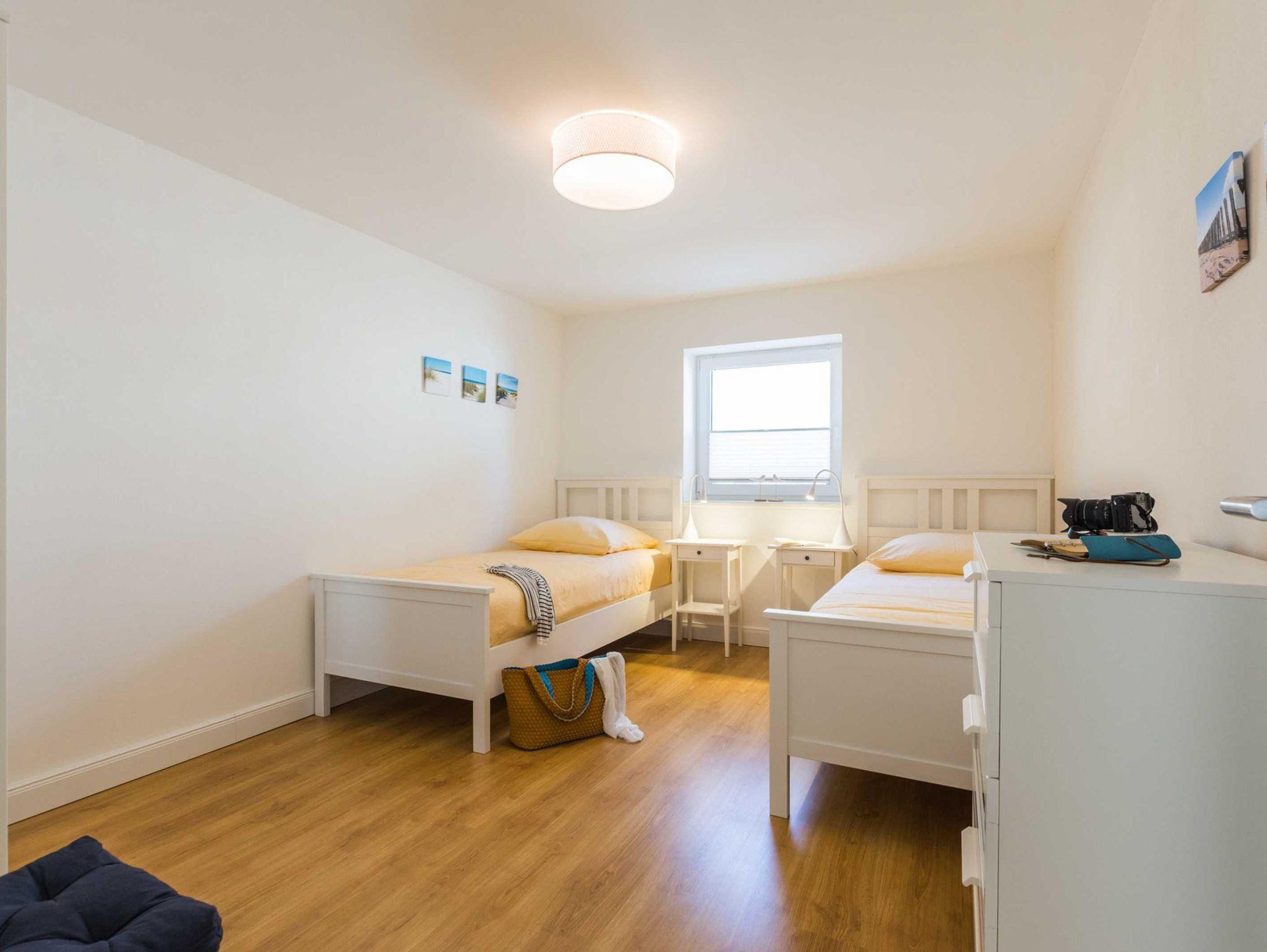 Im großen Schlafzimmer der Ferienwohnung lädt Sie ein komfortables Doppelbett (2 x 90 x 200 cm) zur Nachtruhe ein. Im kleinen Schalfraum stehen für Sie zwei Einzelbetten (je 90x200 cm) bereit. Für zwei weitere Personen wird das Schlafsofa im Wohnbereich mit wenigen Handgriffen zu einem bequemen Schlafplatz (140 x 200 cm). Ein Kleiderschrank und eine Kommode bieten Ihnen ausreichend Stauraum für Ihr Urlaubsgepäck.
