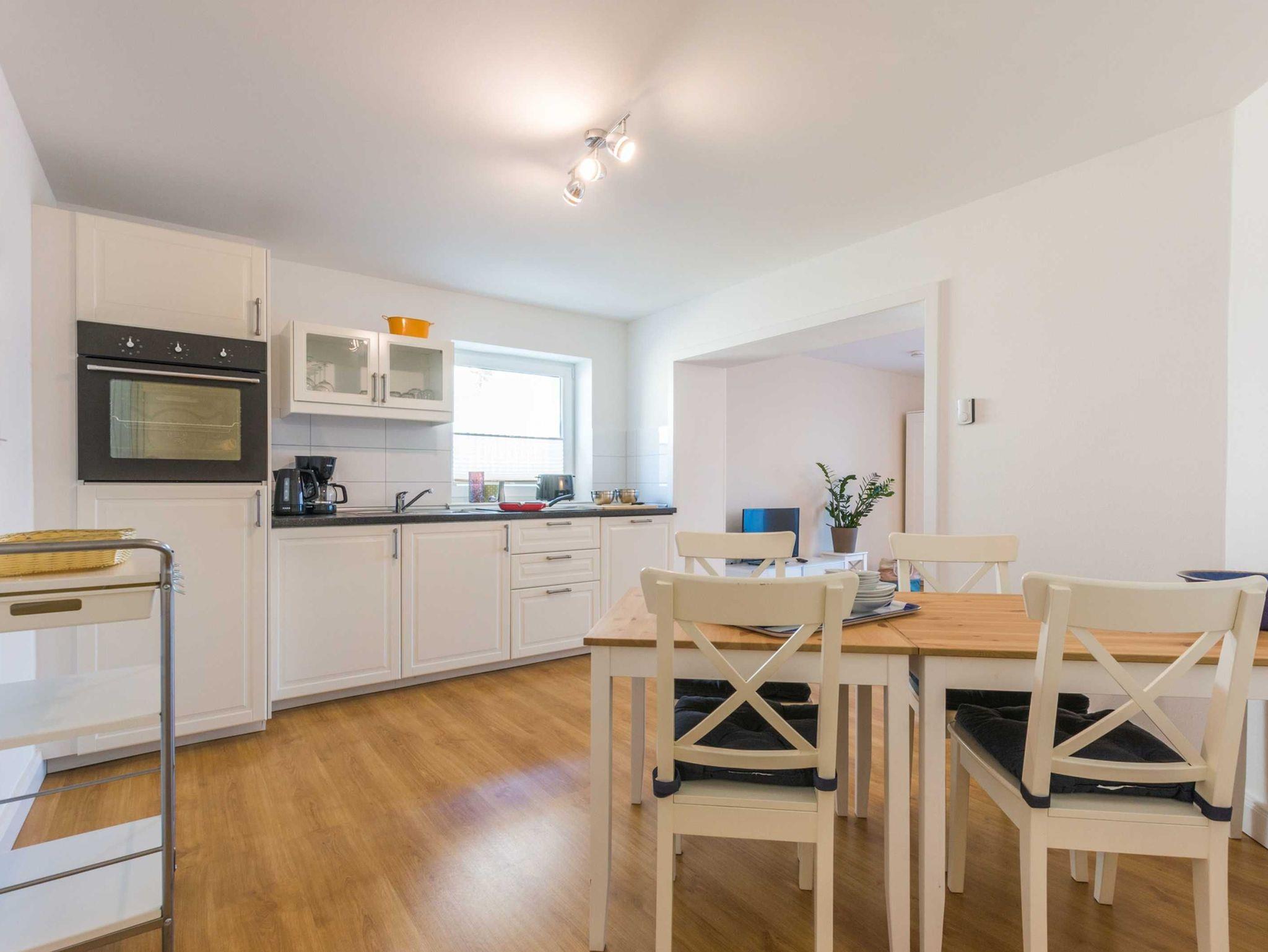 Die Küchenzeile der Ferienwohnung ist für Sie mit einem Backofen, einem 4-Zonen-Cerankochfeld, einem Kühlschrank mit Gefrierfach und einem Geschirrspüler voll ausgestattet. Kleingeräte, wie ein Toaster, eine Kaffeemaschine und ein Wasserkocher, vervollständigen die Kücheneinrichtung.