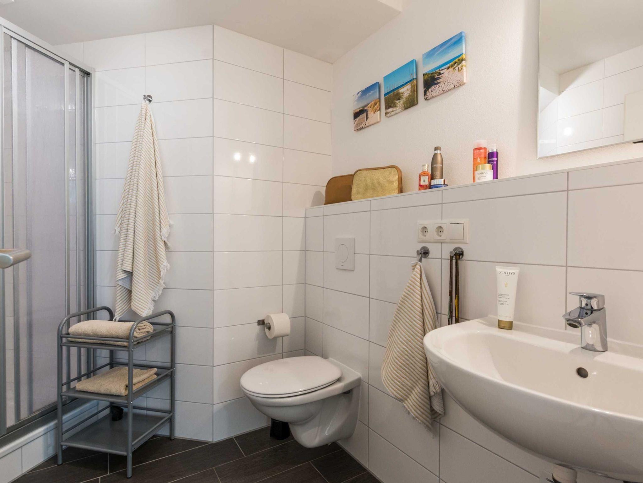 Das Bad verfügt über eine Dusche, ein WC sowie ein Waschbecken. Zum Trocknen und Aufhängen Ihrer Handtücher ist eine Wandheizung vorhanden. Ein Föhn sowie ein Hocker für die kleinen Gäste komplettieren das Bad.