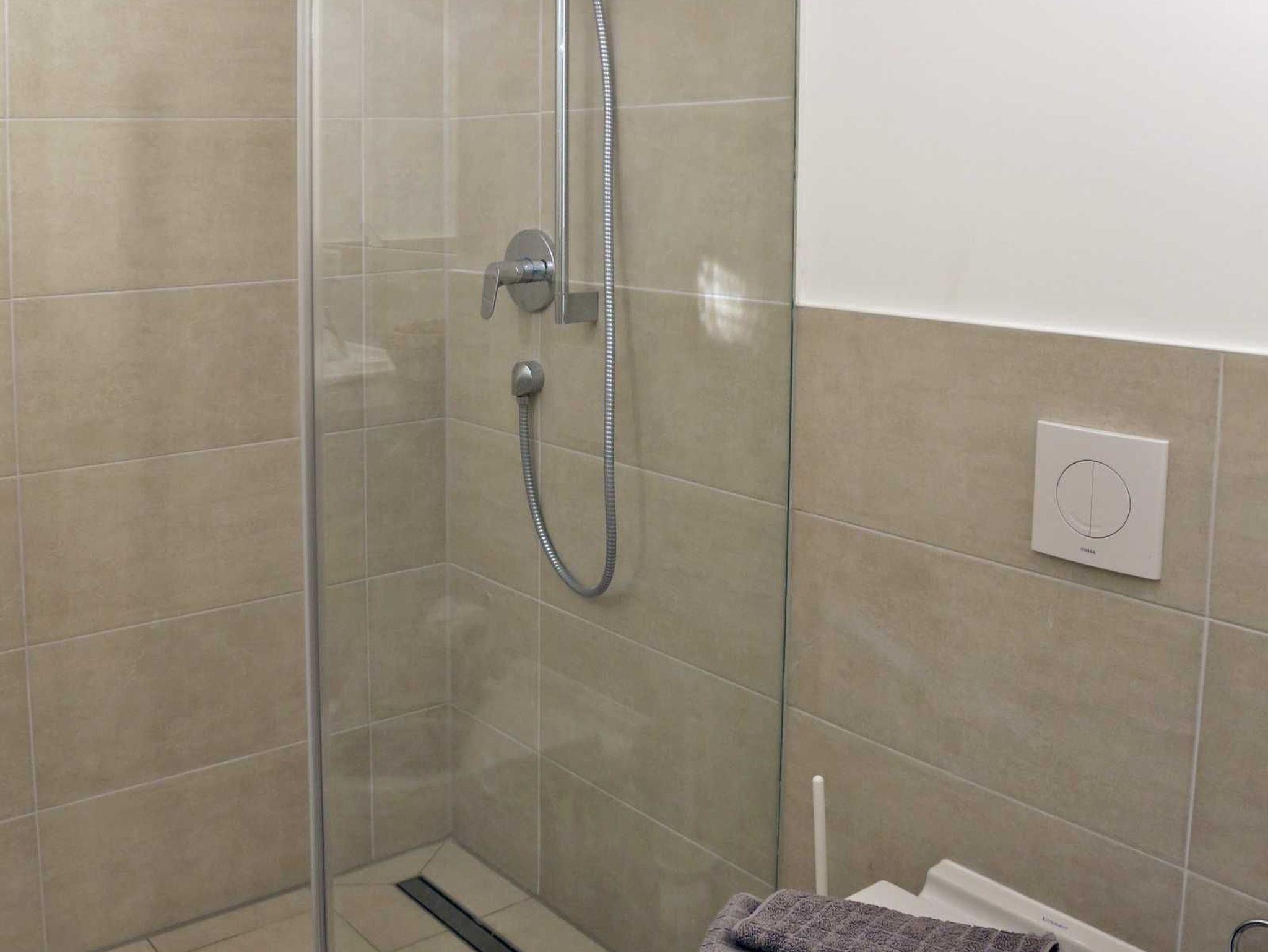 Unser Badezimmer verfügt über eine ebenerdige Dusche, WC, Handtuchheizkörper und Waschtisch.