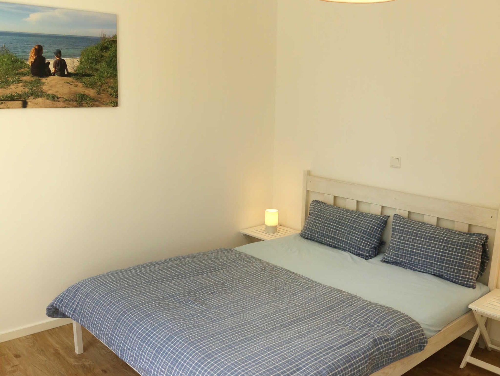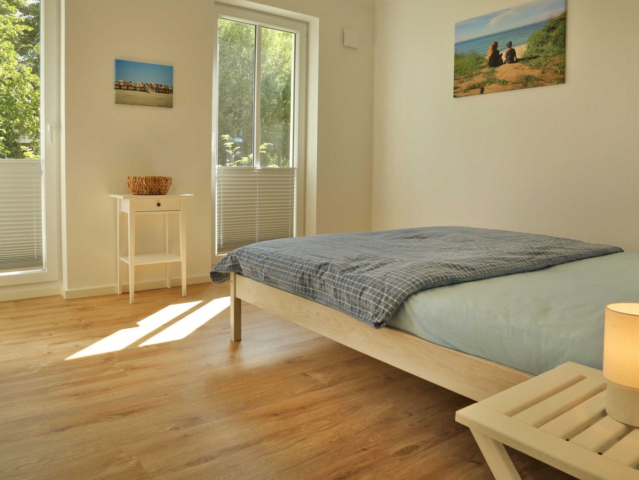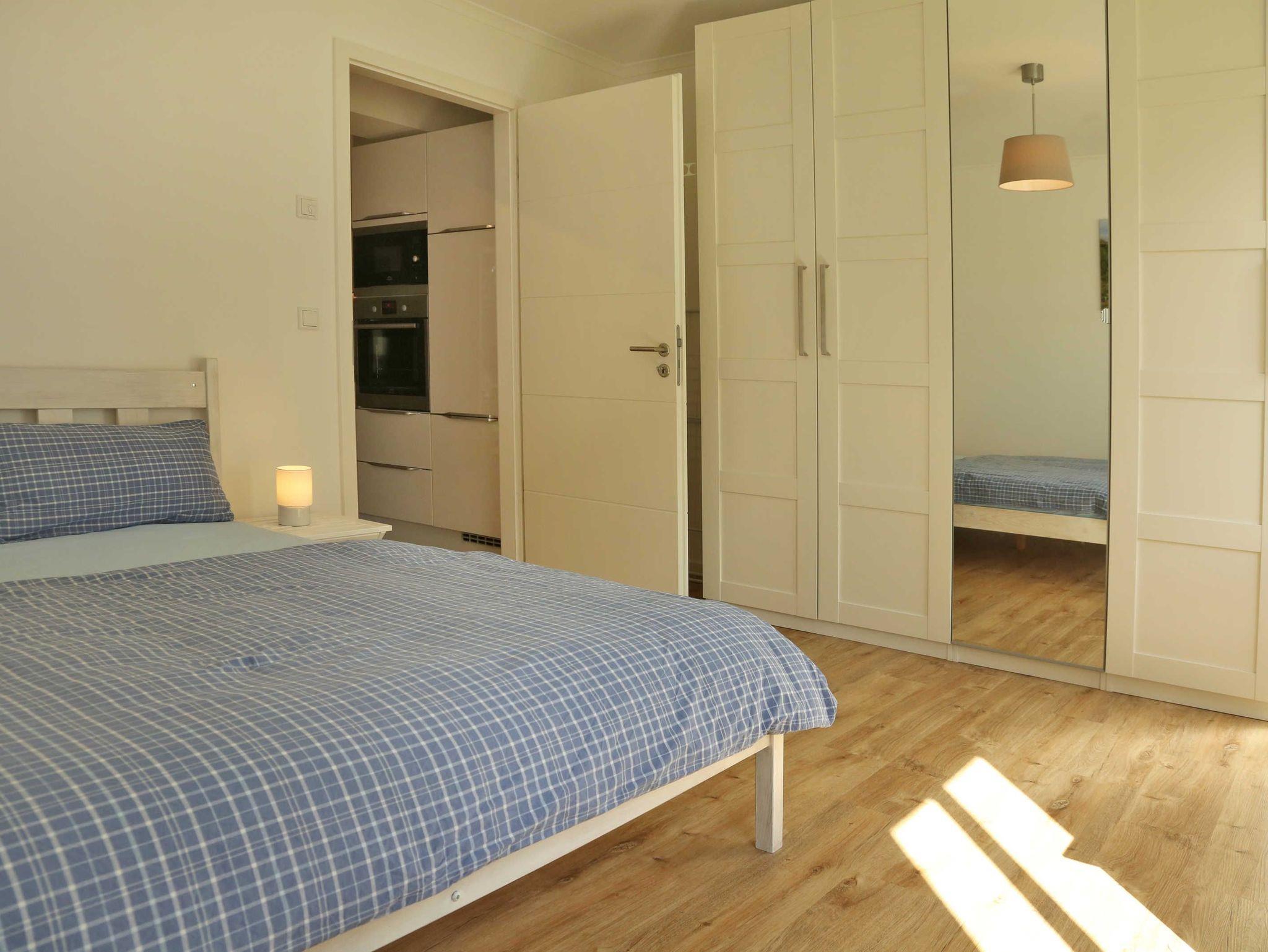 Das Schlafzimmer ist mit einem Doppelbett in der Größe 160cm x 200cm ausgestattet.