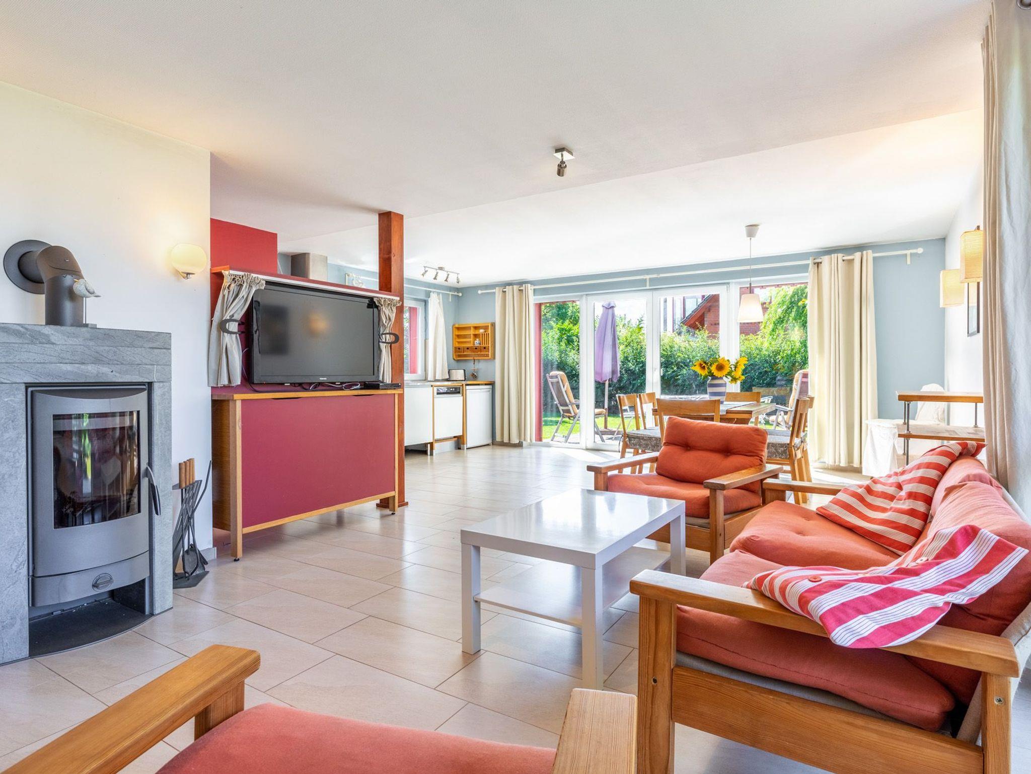 • Erdgeschoss: Grosses Wohnzimmer mit Essbereich mit Gartenblick und Terrassenzugang, Eßtisch, Sitzecke (Schlafcouch 1,60m x 2m im Erdgeschoß) mit Kaminofen und Flachbild- TV, Fussbodenheizung. Küchenzeile (Kühlschrank/ Gefrierfach, Induktionskochfeld (4 Kochfelder), Mikrowellenofen mit Grill/ Heissluft, Geschirrspüler. Duschbad/ WC (4,5m²).