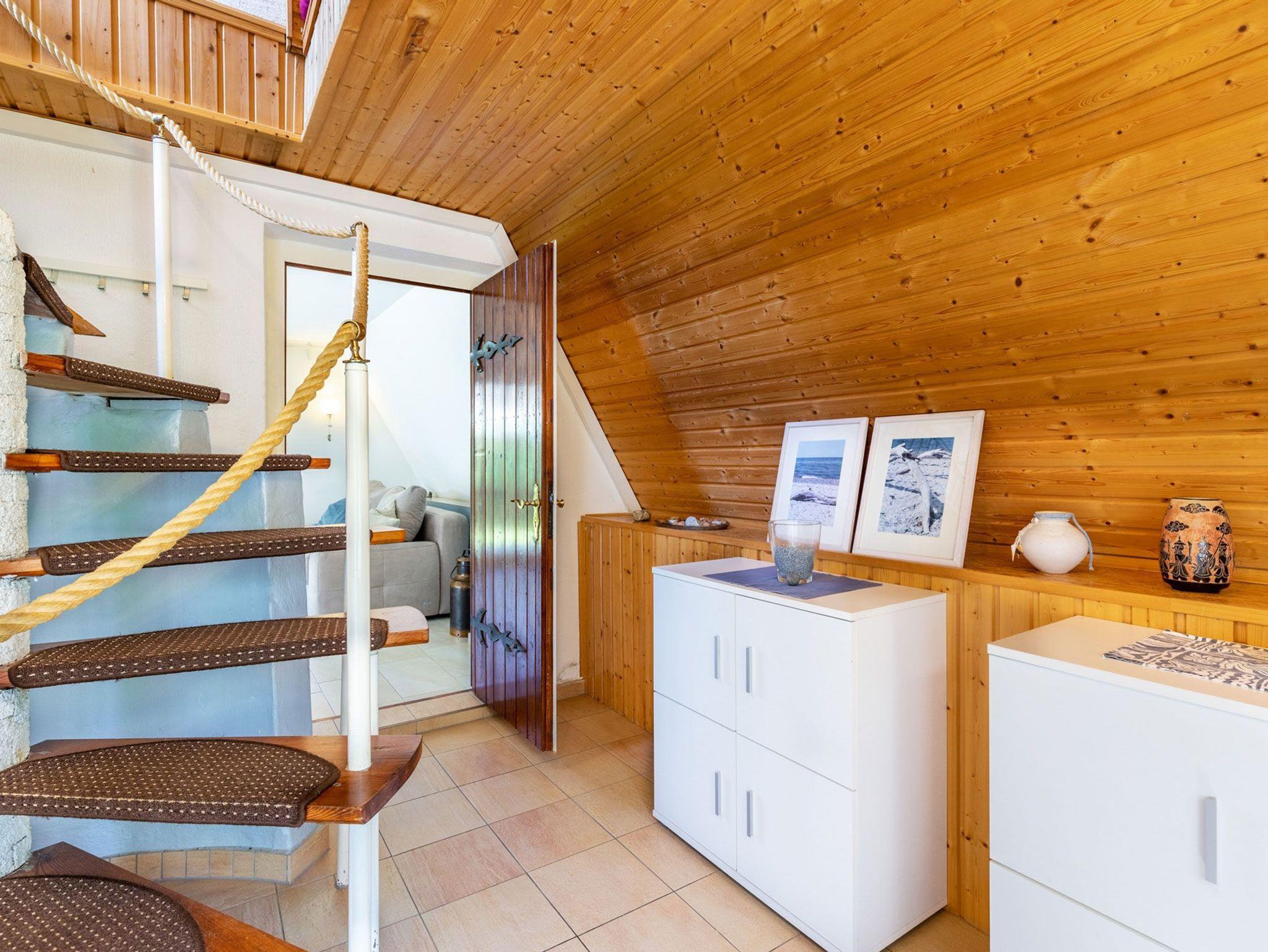 • 2 kleine Schlafzimmer mit Heizkörper unter Dachschrägen: 1 kleines Kinderzimmer (2 Einzelliegen), 1 Schlafzimmer (Doppelbett 1,60m x 2m + Zusatzbett 0,80m x 1,80m), Babybett stellbar. Balkon mit Meerblick.