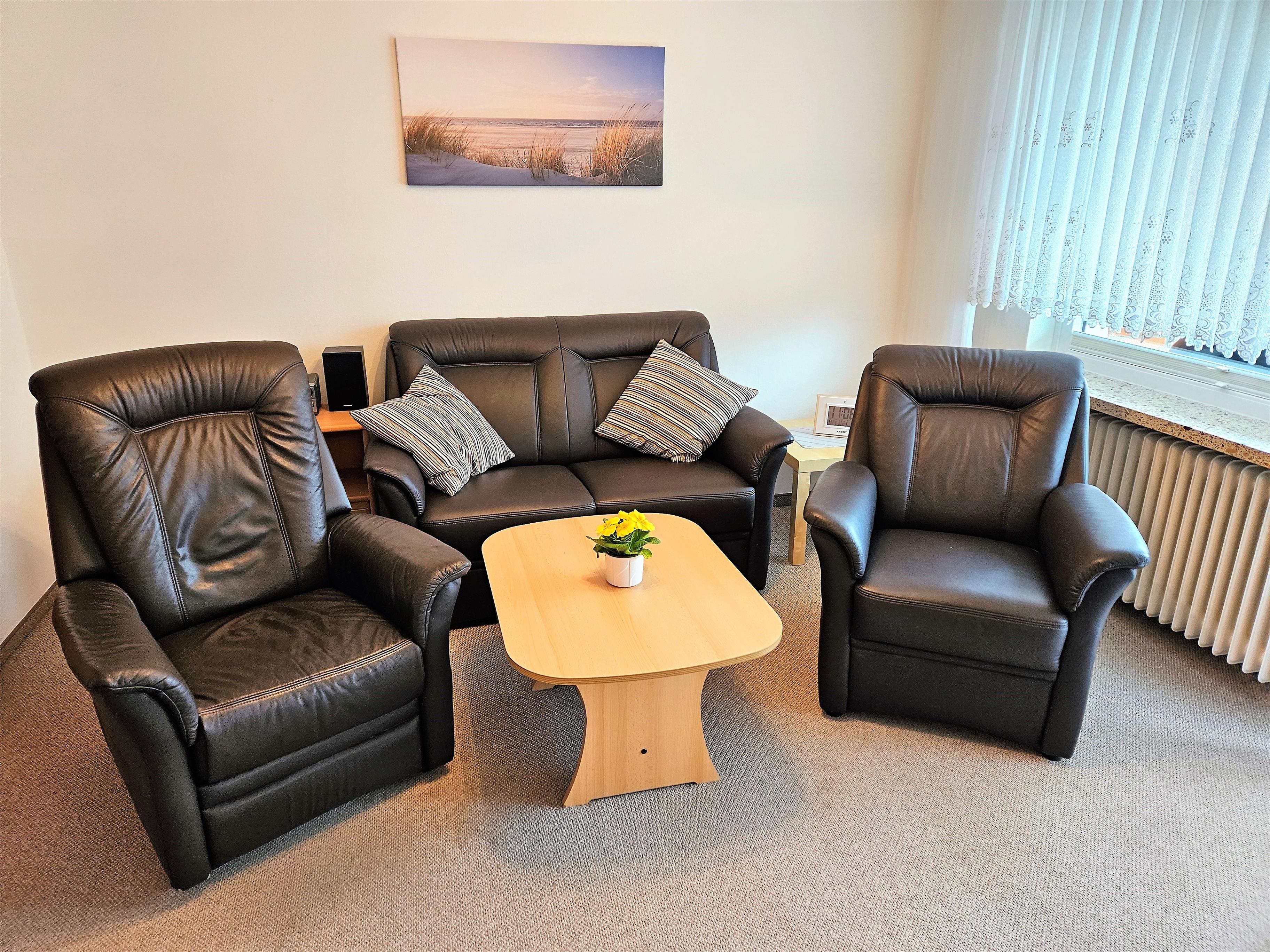 Das lichtdurchflutete Wohnzimmer ist in zwei Bereiche unterteilt: