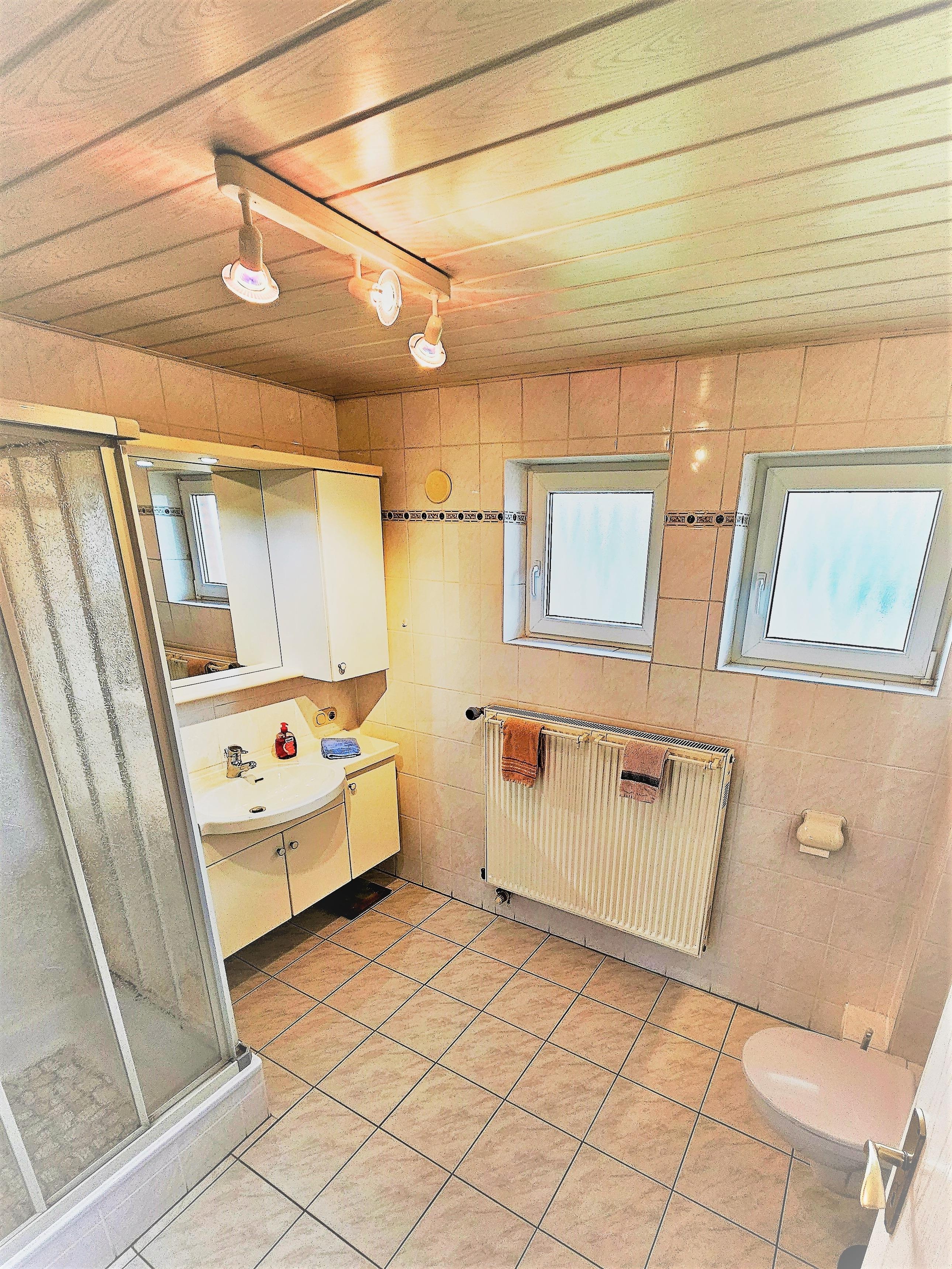 Ein großes Badezimmer mit moderner Dusche, WC und Waschtisch bietet ausreichend Platz zur Erfrischung.