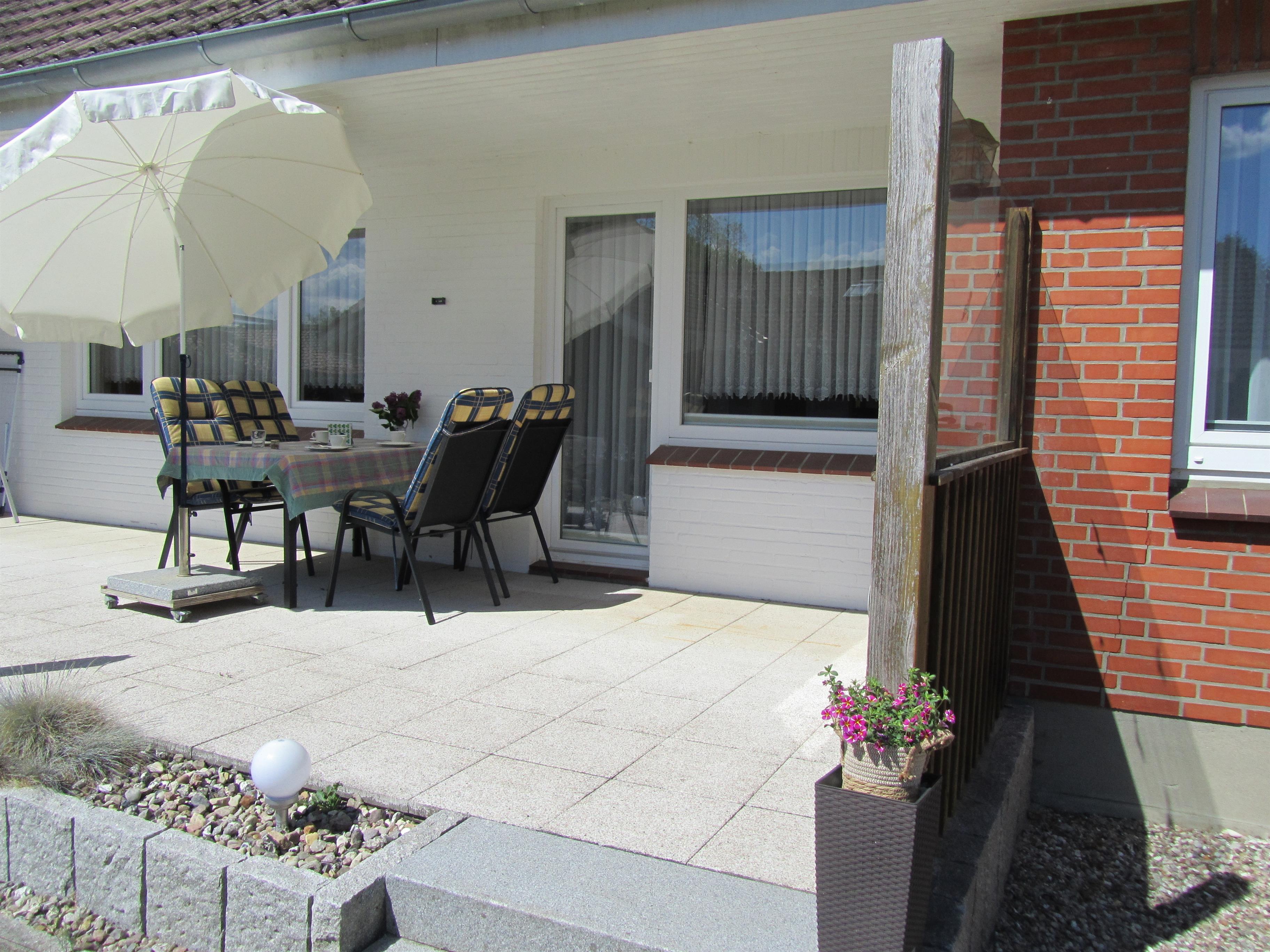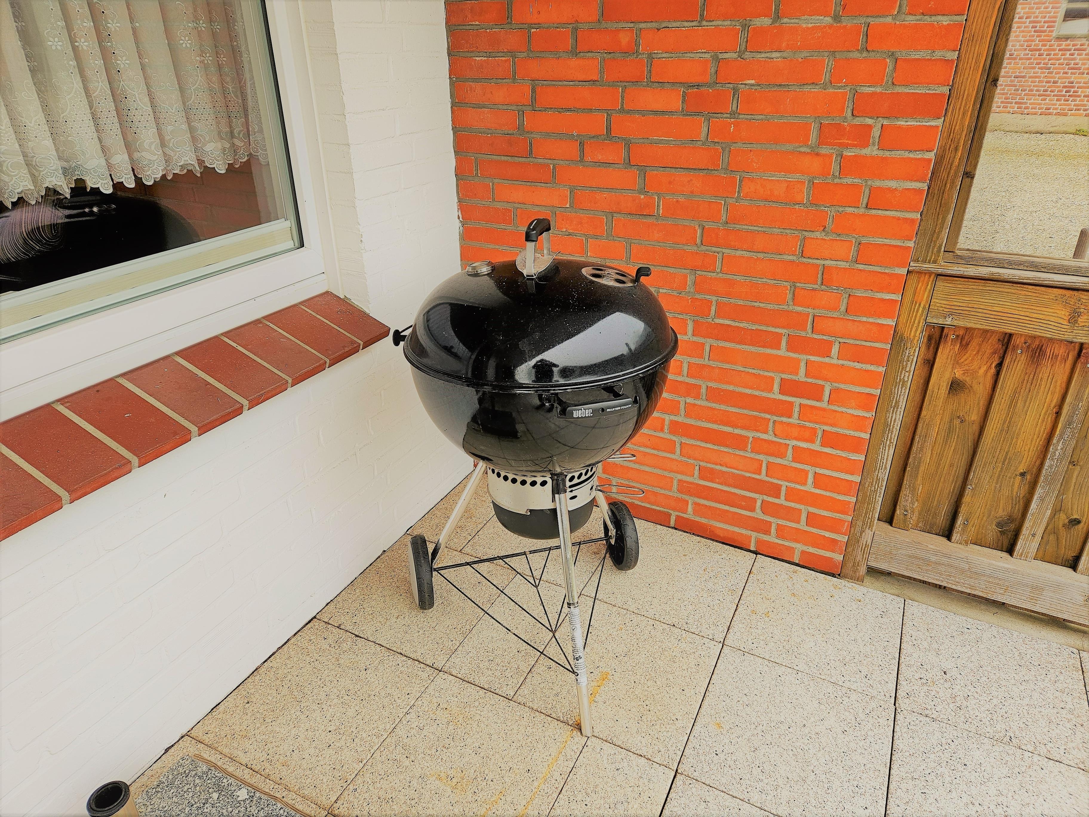 Die überdachte, windgeschützte Terrasse ist direkt vom Wohnzimmer zugänglich und bietet bequeme Sitzgelegenheiten sowie einen Weber-Grill für Grillabende.
