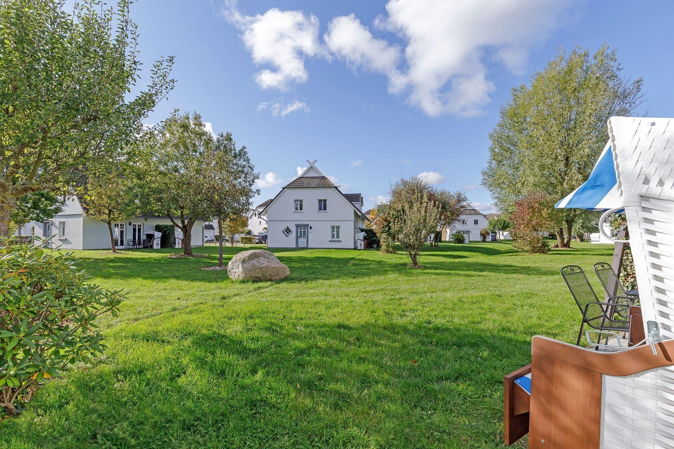 Für ein Highlight im Außenbereich des Hauses sorgt die idyllisch wirkende Terrasse. Moderne Gartenmöbel und ein maritim anmutender Strandkorb laden hier zum Verweilen mit der Familie ein. Weitläufige, sehr gepflegte Grünflächen umgeben das Ferienhaus. Die Ruhe ausstrahlende Umgebung garantiert Ihnen perfekte Urlaubstage.