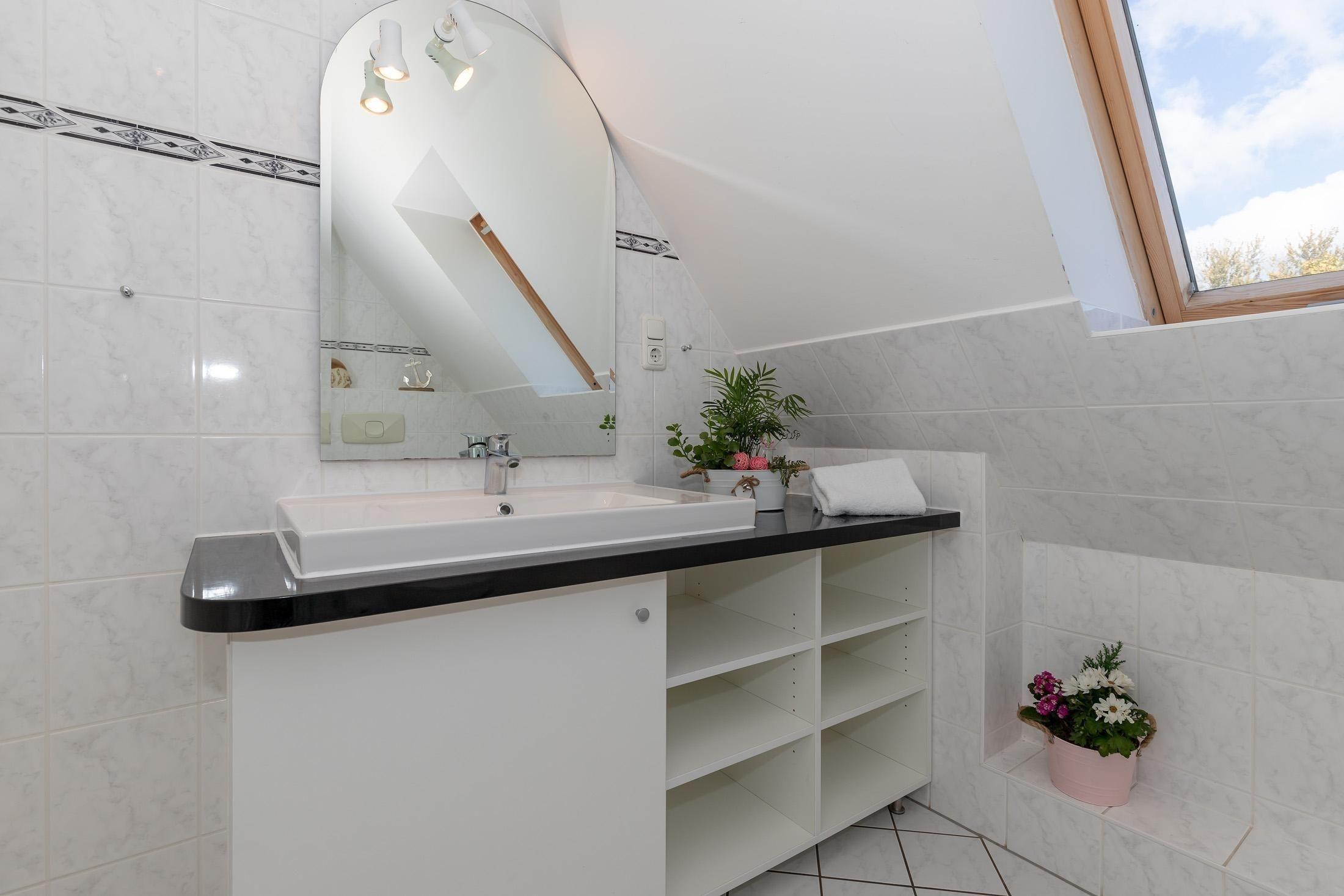 Das moderne Badezimmer verfügt über eine Dusche, ein WC, ein Waschbecken mit geräumigem Unterschrank, einen Handtuchheizkörper sowie ausreichend Ablageflächen für Ihre Badutensilien.