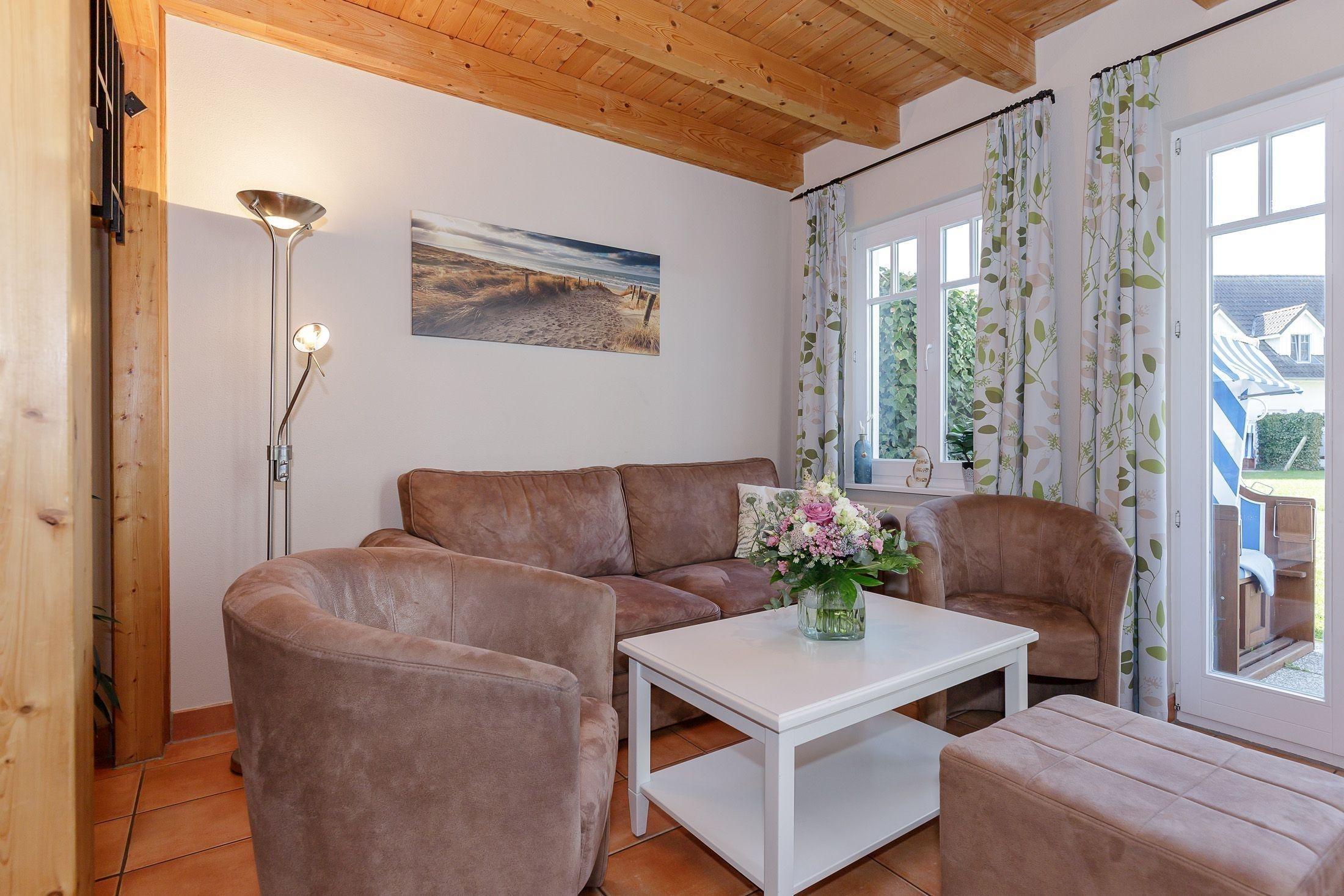Der komfortabel und liebevoll möblierte Wohnbereich ist ausgestattet mit zwei Sesseln sowie einer Sofa-Garnitur. Hier befindet sich der Mittelpunkt des Hauses für die ganze Familie.