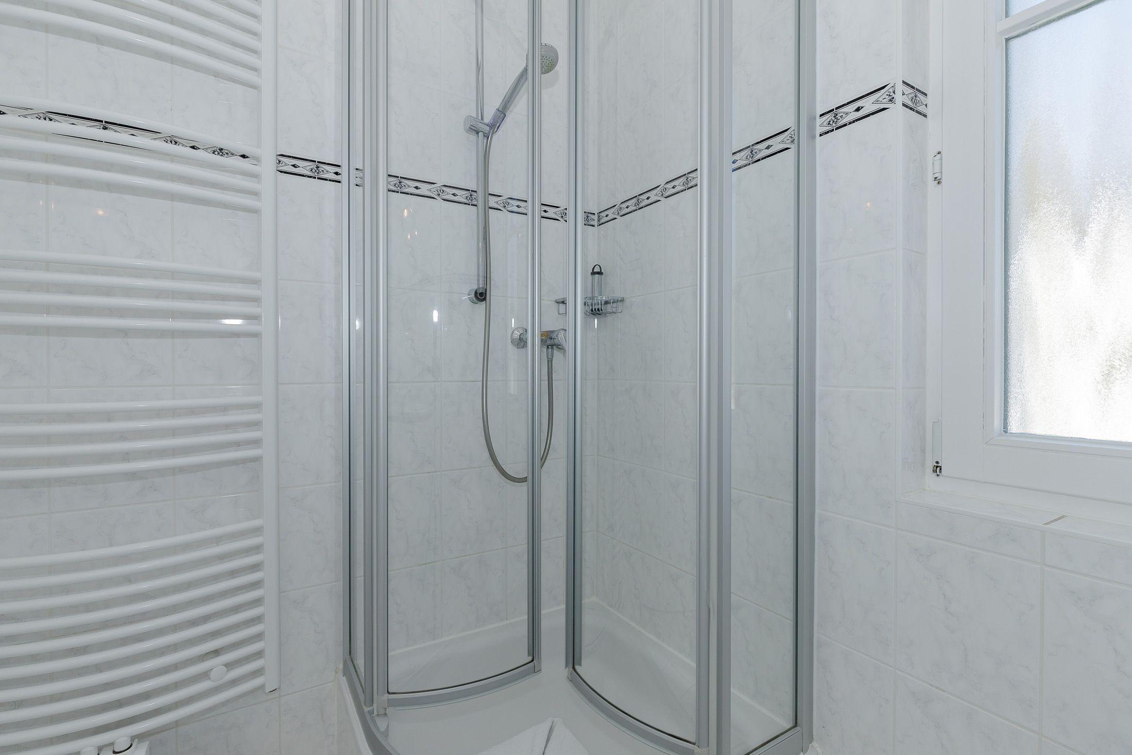 Ebenfalls im Obergeschoss finden Sie das Badezimmer. Dieses ist ausgestattet mit einer Dusche, einem WC sowie einem Waschbecken mit Unterschrank. Ablageflächen für Ihre Bad-Utensilien sind ebenfalls vorhanden.