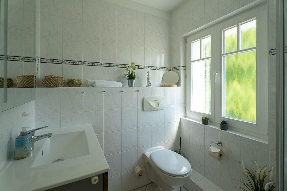 Auch das hochwertig ausgestattete Badezimmer befindet sich auf dieser Ebene. Es ist mit einer Dusche, einem WC, einem Handtuchheizkörper und einem Waschbecken mit Unterschrank eingerichtet. Ablageflächen für Ihre Bad-Utensilien stehen Ihnen ebenfalls zur Verfügung.