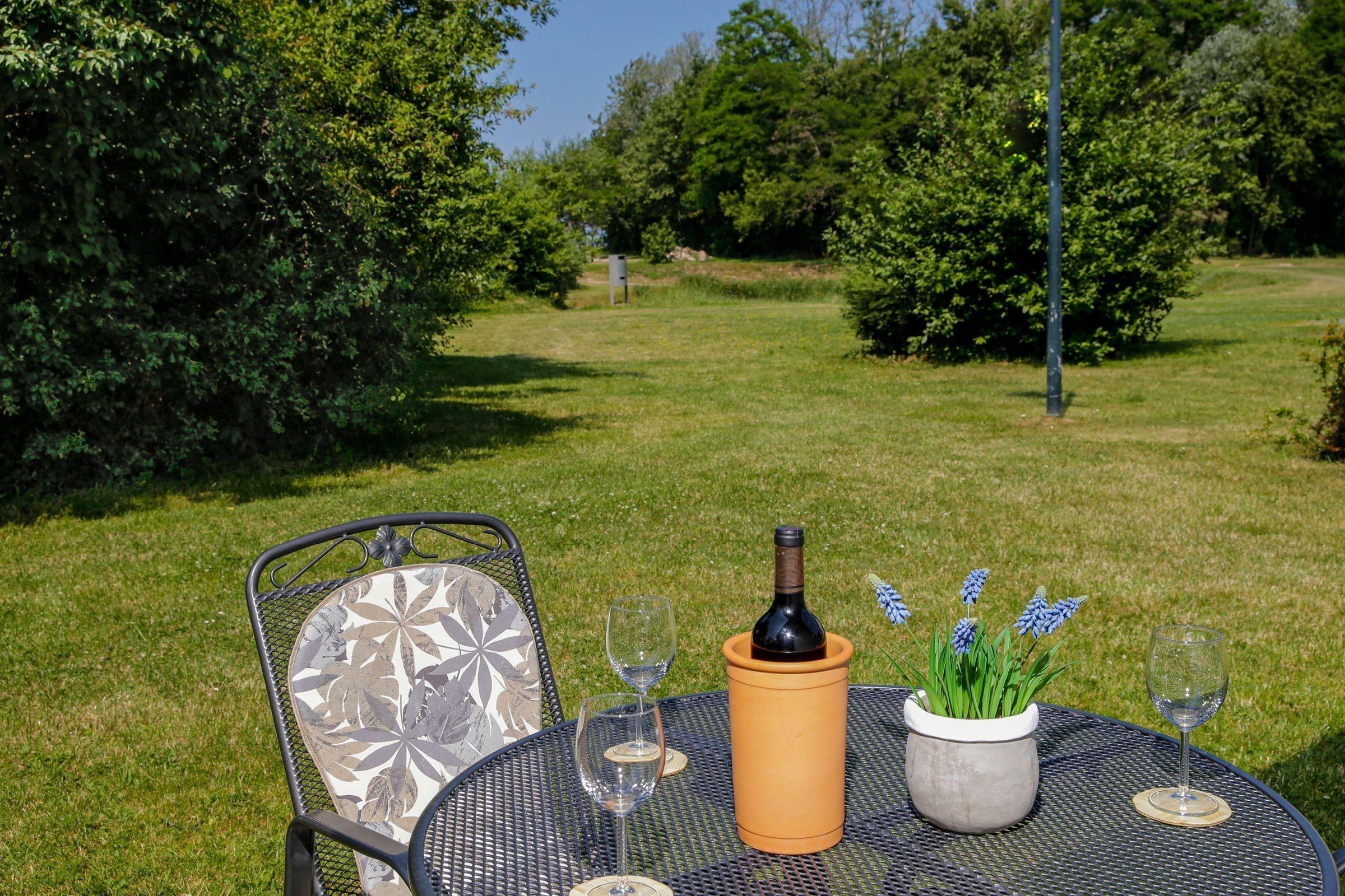 Die sonnendurchflutete Terrasse, ausgestattet mit modernen Gartenmöbeln, lädt zum Verweilen der ganzen Familie zu einem gemütlichen Beisammensein ein. Genießen Sie den großartigen freien Blick auf die nahe Umgebung und die weiten, gepflegten Rasenflächen, die die Terrasse umfassen. Ein hübscher Strandkorb für das maritime Ambiente rundet das geschmackvolle Gesamtbild der Terrasse ab.