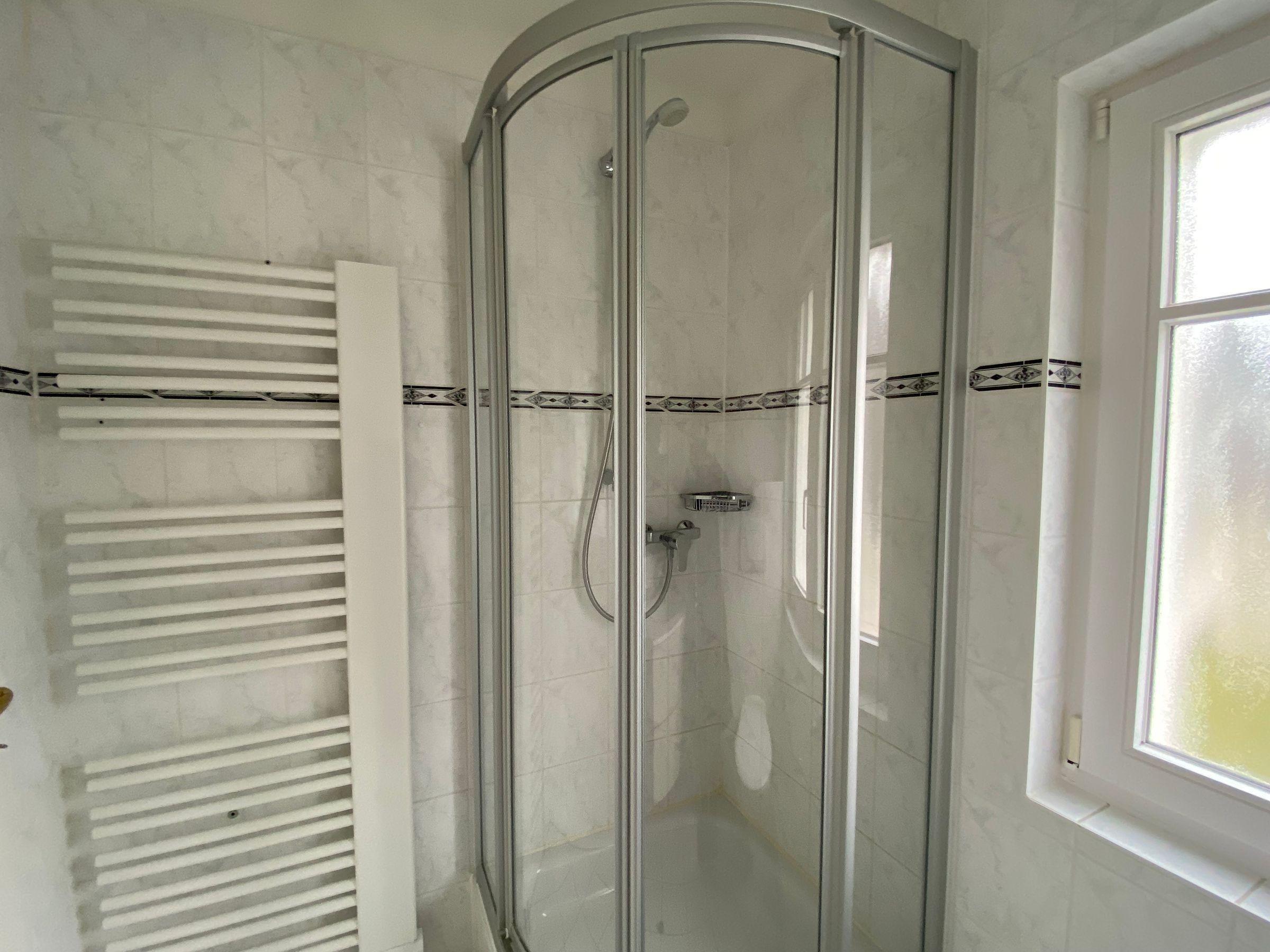 Auf dieser Ebene befindet sich ebenfalls das Badezimmer mit einer Dusche, einem Waschbecken und einem WC. Ein Handtuchheizkörper und viele Ablageflächen für Ihre Badutensilien vervollständigen das modern eingerichtete Badezimmer.