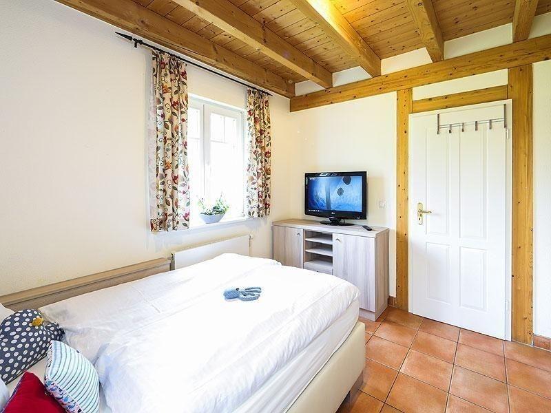Über eine Wendeltreppe gelangen Sie in das Obergeschoss. Hier stehen drei weitere Schlafzimmer für Sie bereit. Diese sind eingerichtet mit je einem komfortablen Doppelbett sowie einem Kleiderschrank mit viel Platz für Ihre Urlaubsgarderobe. In einem dieser Zimmer finden Sie ein zusätzliches Fernsehgerät.