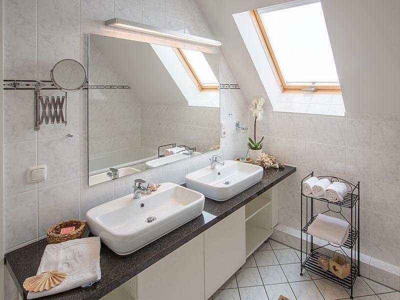 Das zweite Badezimmer befindet sich ebenfalls auf dieser Ebene und ist ausgestattet mit einer Badewanne, einem WC, zwei Aufsatzwaschbecken mit integriertem Unterschrank sowie genügend Ablageflächen für Ihre Badutensilien.