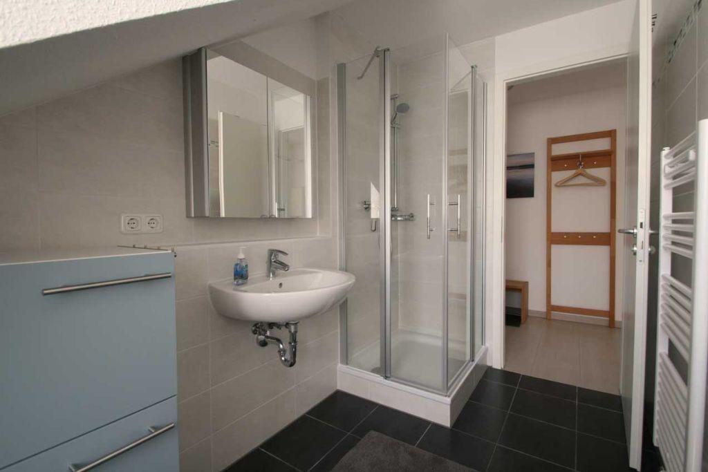 Die Wohnung verfügt über ein Duschbad mit Spiegelschrank und Waschmaschine. Alle Räume sind separat begehbar. Die Terrassentüren sind für eine Verdunkelung mit Außen-Rollläden ausgestattet, alle weiteren Fenster sind mit Plissees versehen. Die gesamte Ferienwohnung besitzt Fußbodenheizung, das Bad ergänzend einen Handtuchheizkörper.