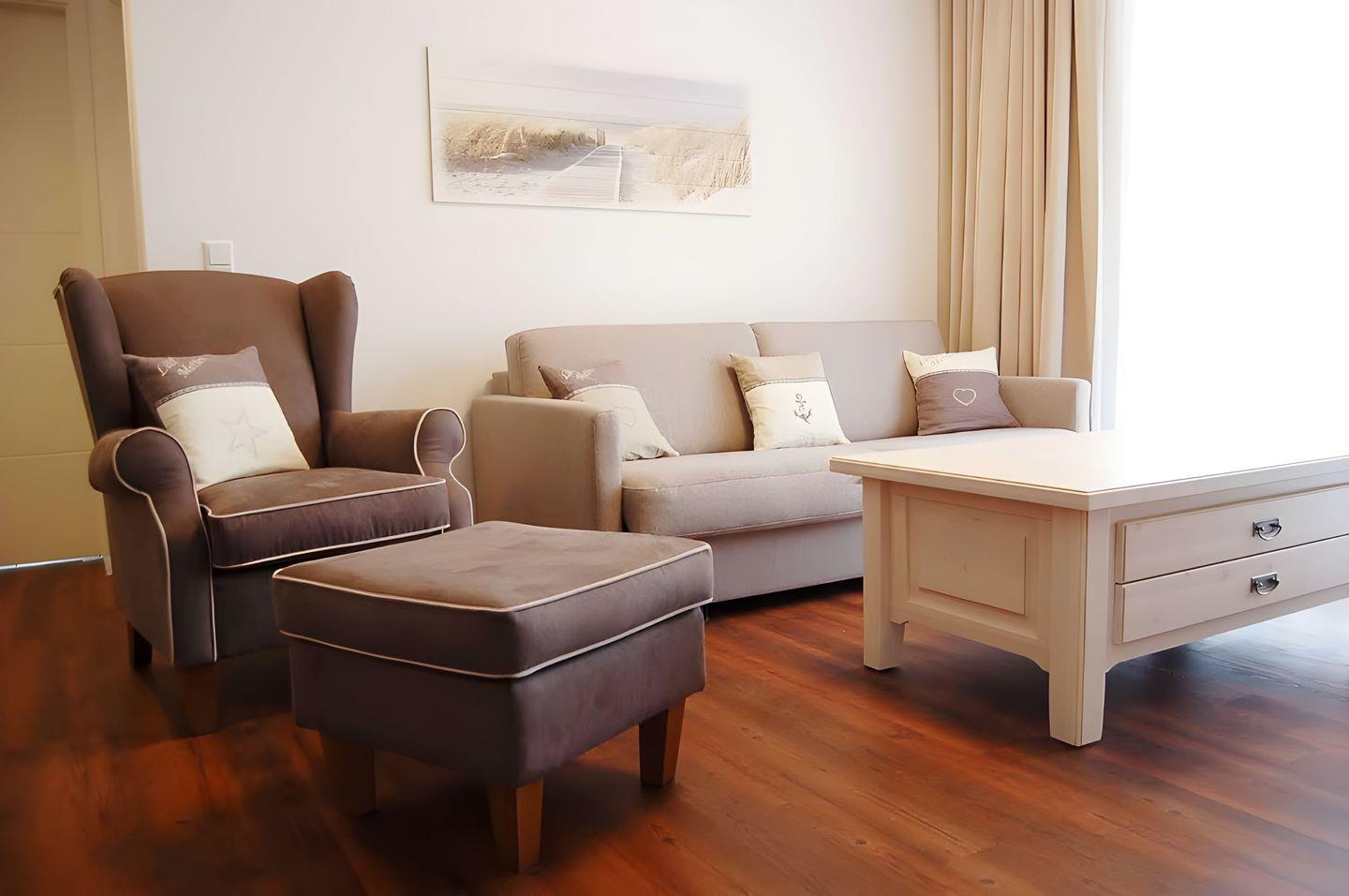 Freuen Sie sich auf wunderbare Tage am Strand und gleichzeitig auf die gediegene Atmosphäre Ihres 59 Quadratmeter großen Apartments im bequem erreichbaren Erdgeschoss mit einem großzügigen Koch-, Ess- und Wohnbereich. Der Wohnbereich verfügt über eine große und gemütliche Schlafcouch. Weiterhin bietet dieses wunderschöne Apartment zwei geräumige Schlafzimmer mit einem Doppelbett und einem Bett mit Ausziehfunktion für eine zweite Person und großzügigen Kleiderschränken. Das Duschbad ist mit einer bodengleichen Dusche, einem großen Waschtisch und Wandspiegel ausgestattet. Auf der mit Tisch und sechs Relax-Stühlen möblierten Terrasse können Sie viele gemütliche Sonnen- oder Abendstunden verbringen.