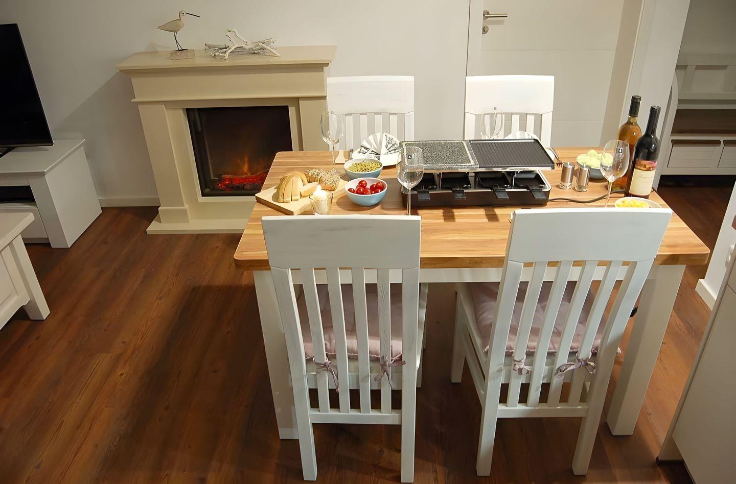 Für Spaß und Unterhaltung sorgen in allen drei Räumen große Flachbildschirm-Fernseher und ein zusätzlicher DVD-Spieler im Wohnbereich mit einem attraktiven DVD-Archiv. An Herbst- und Wintertagen sorgt, neben der in allen Räumen verlegten Fußbodenheizung, ein moderner Elektro-Kamin für Wärme und Gemütlichkeit.