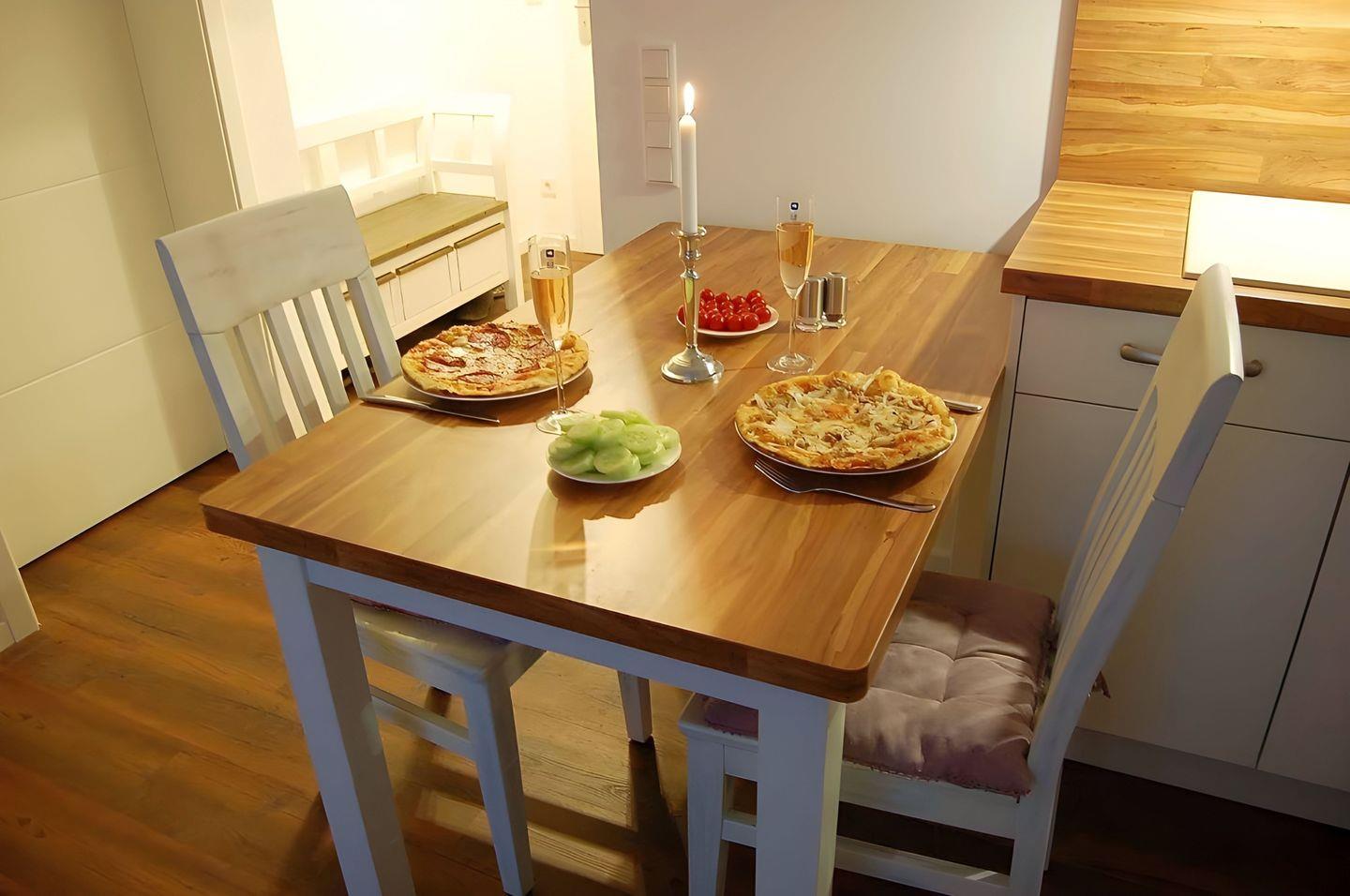 Die moderne, familienfreundliche Ausstattung lässt selbst die im Ostseebad Nienhagen seltenen Regentage in der Ferienwohnung zum Erlebnis werden. Nutzen Sie die vielseitigen Möglichkeiten der hochwertigen Einbauküche, in der ein Induktionsherd, Mikrowelle, Kühl-Gefrier-Kombination, Geschirrspüler, Kaffeemaschine, Wasserkocher, Toaster sowie umfangreich bestückte Geschirrschränke und Besteckfächer zum Standard gehören.