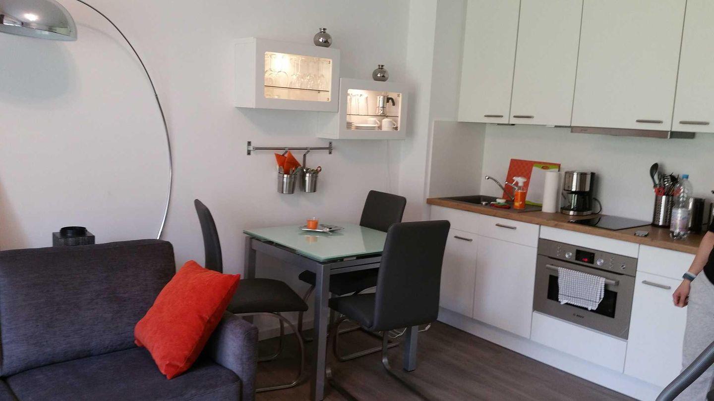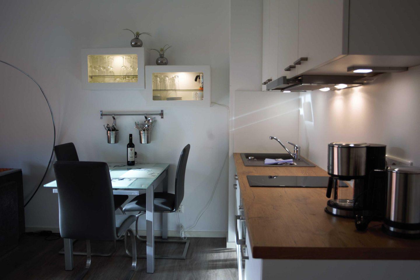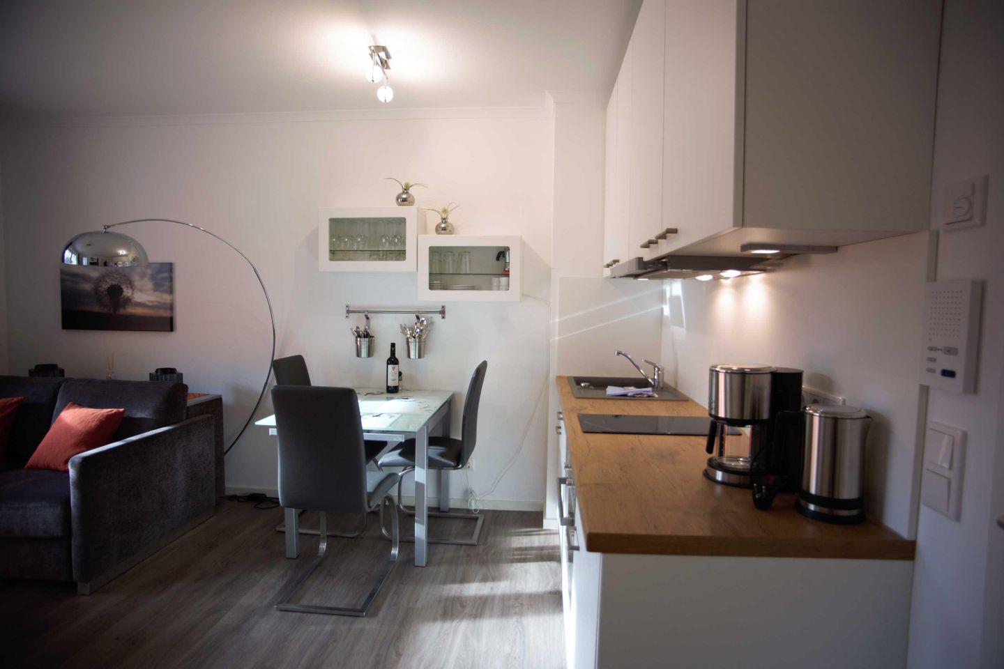 Im offenen Ess- und Küchenbereich finden Sie einen Tisch mit vier Stühlen und eine moderne Einbauküche mit einem Zwei-Feld-Ceranfeld, Geschirrspüler, Kühlschrank mit Gefrierfach, Backofen mit Mikrowellenfunktion, Kaffeemaschine, Wasserkocher und Toaster.