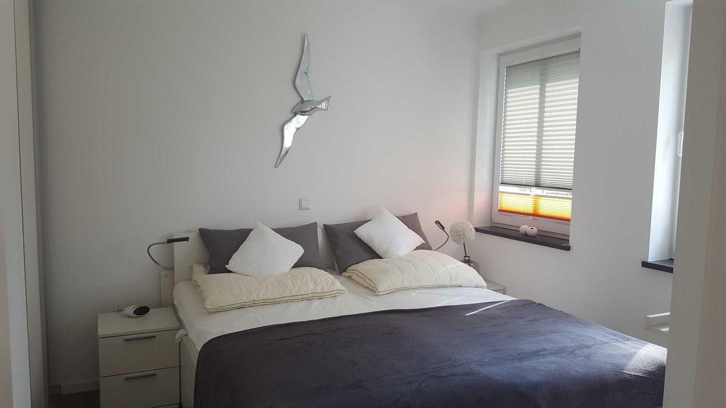 Im freundlichen Schlafzimmer haben Sie ein komfortables Doppelbett, einen geräumigen Einbaukleiderschrank und ein Flatscreen-TV. Das Badezimmer bietet eine ebenerdige Dusche sowie einen großen Waschtisch mit durchgehendem Spiegel und Fön. Die Ferienwohnung hat eine Fußbodenheizung und es gehört ein kostenfreier Außenstellplatz (ca. 30m vom Objekt entfernt) dazu.