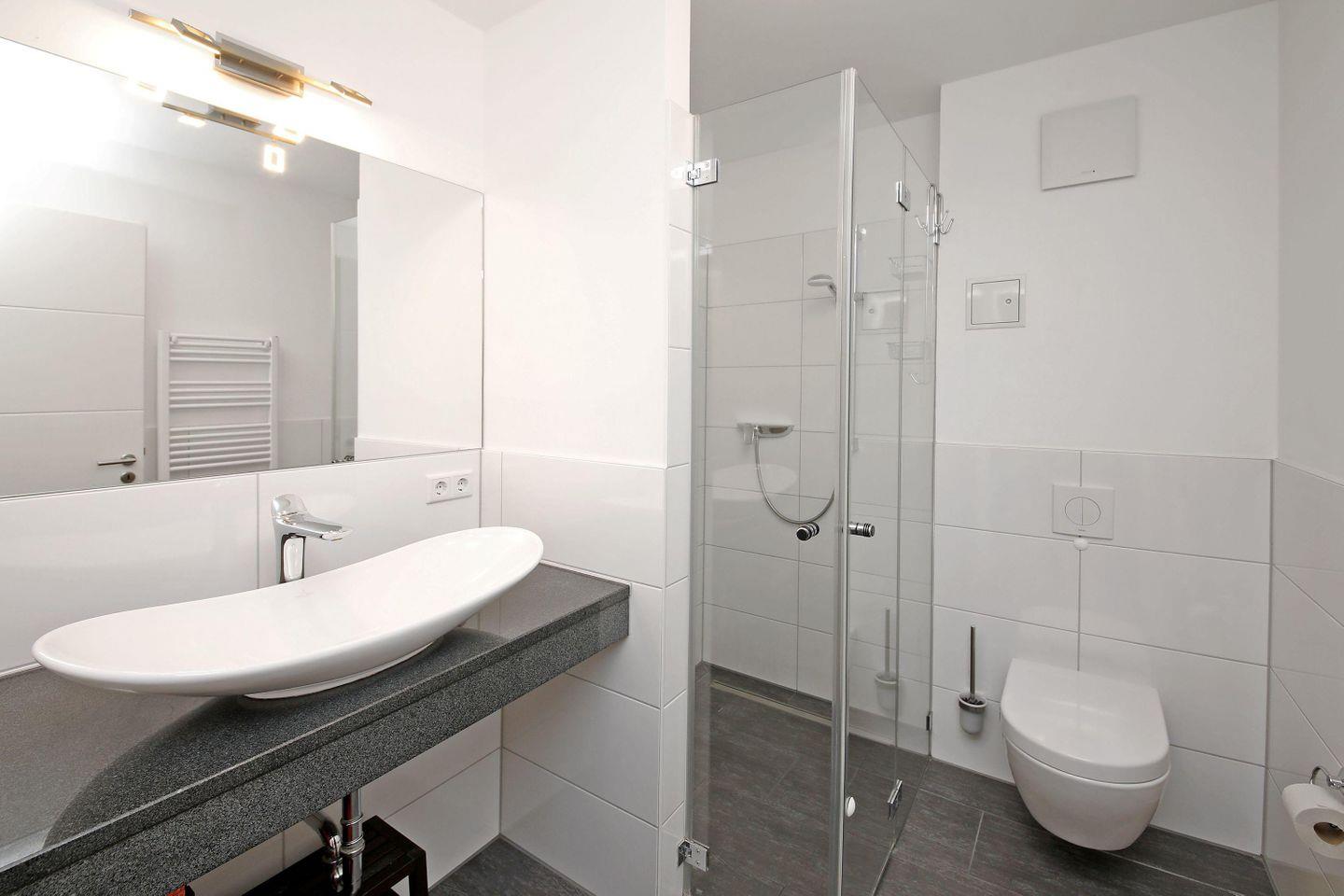 Aufsatz-Waschtisch, einem Wandspiegel und einem Fön ausgestattet. Ferner rundet