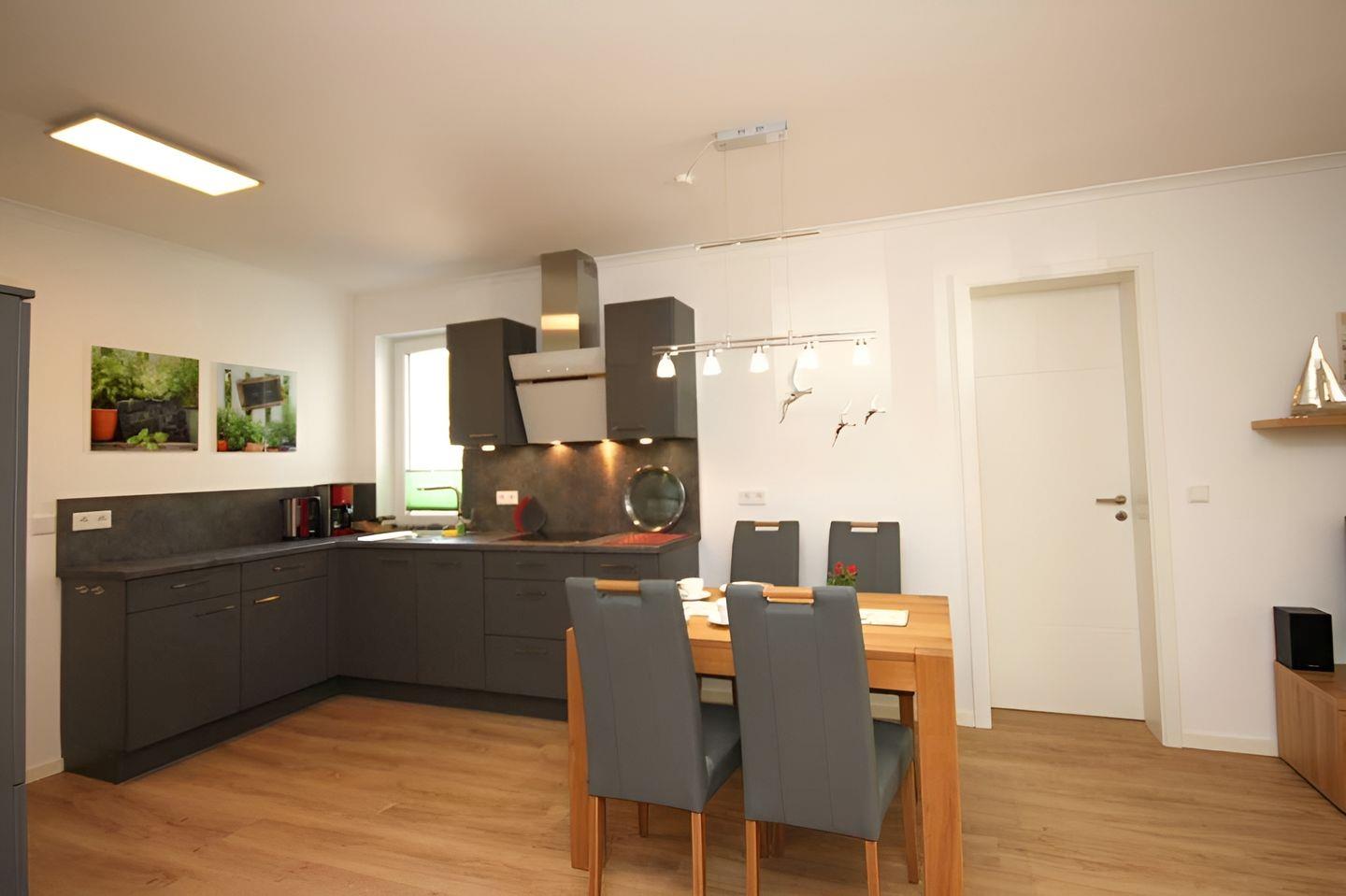 Im großzügigen Wohnbereich mit moderner offener Küche befinden sich bequeme