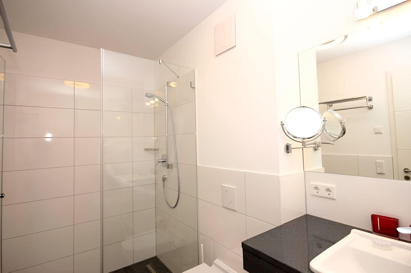 Das Badezimmer ist elegant gefliest mit ebenerdiger Dusche, zusätzlich sind ein