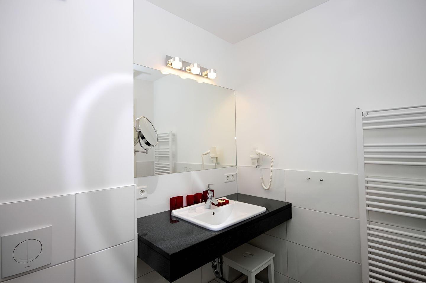elektrisch beheizbarer Handtuchhalter, ein Kosmetikspiegel und ein Haarfön