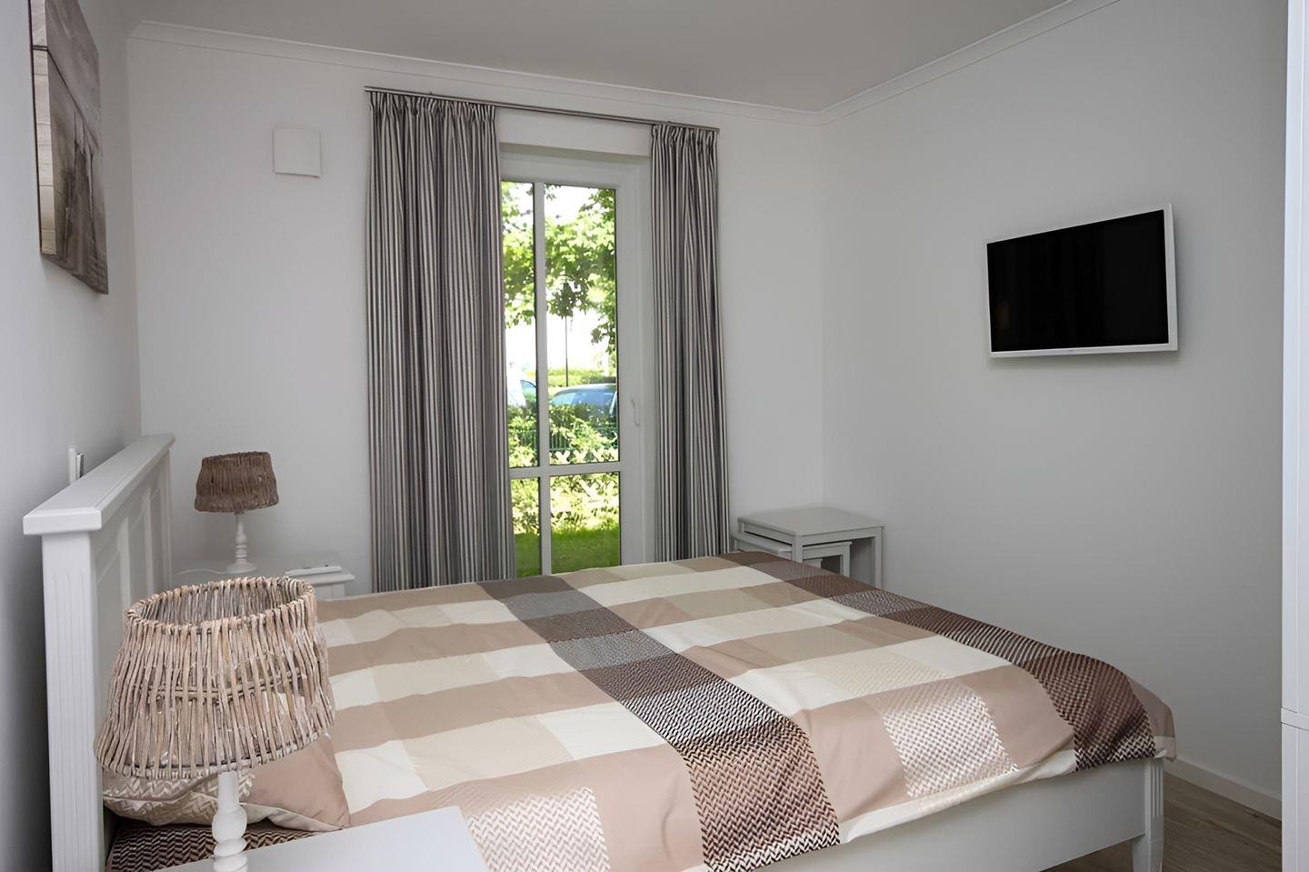 Kleiderschrank sowie Flat-Screen-TV. Ein Doppelbett sorgt für einen erholsamen