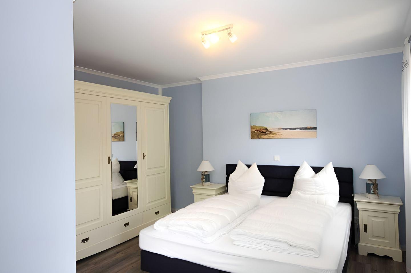 • Schlafzimmer mit großem Boxspringbett, Kleiderschrank, Nachtkonsolen und