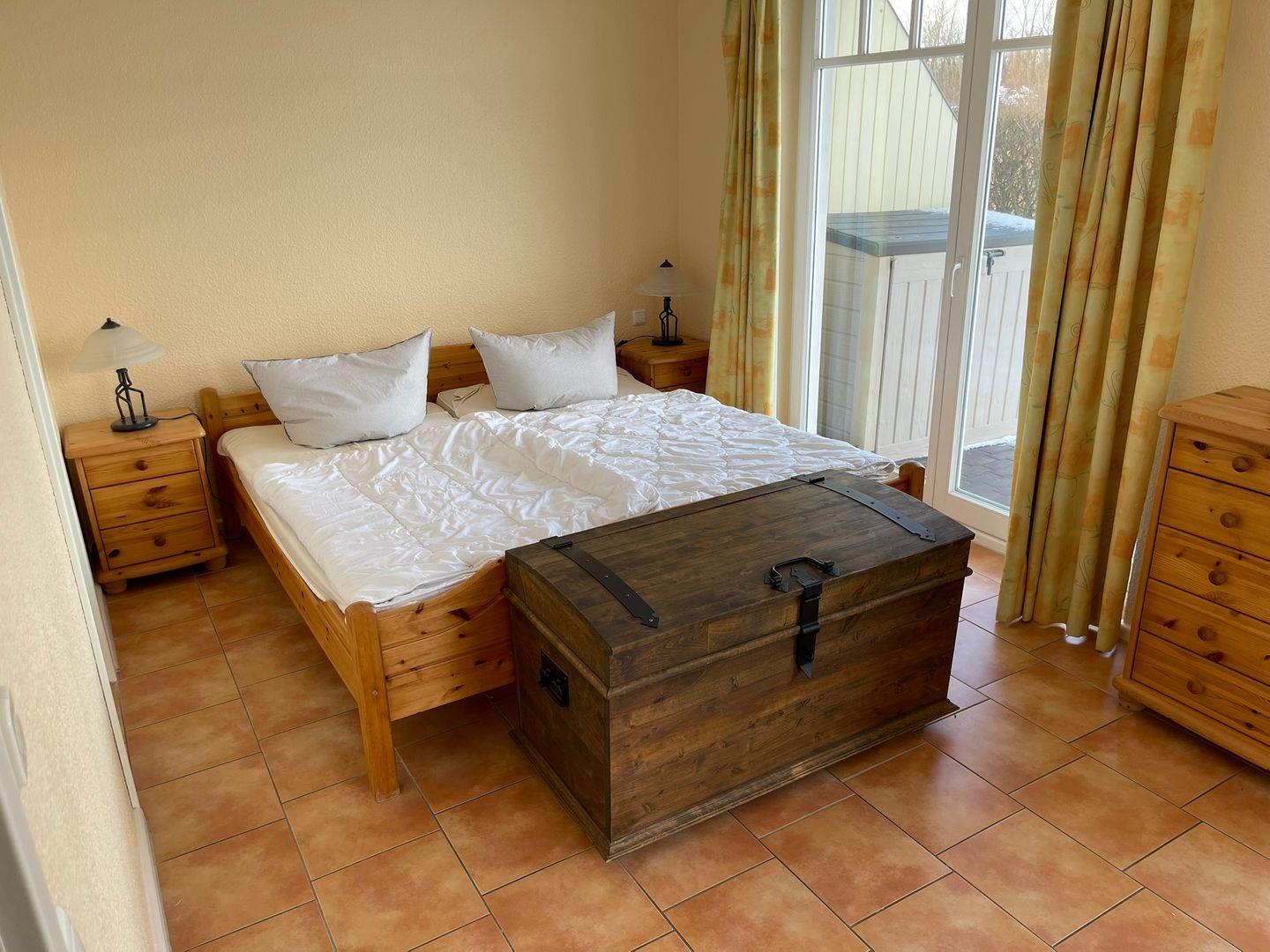 * Ein separates Schlafzimmer mit bequemem Doppelbett und Zugang zur Terrasse.