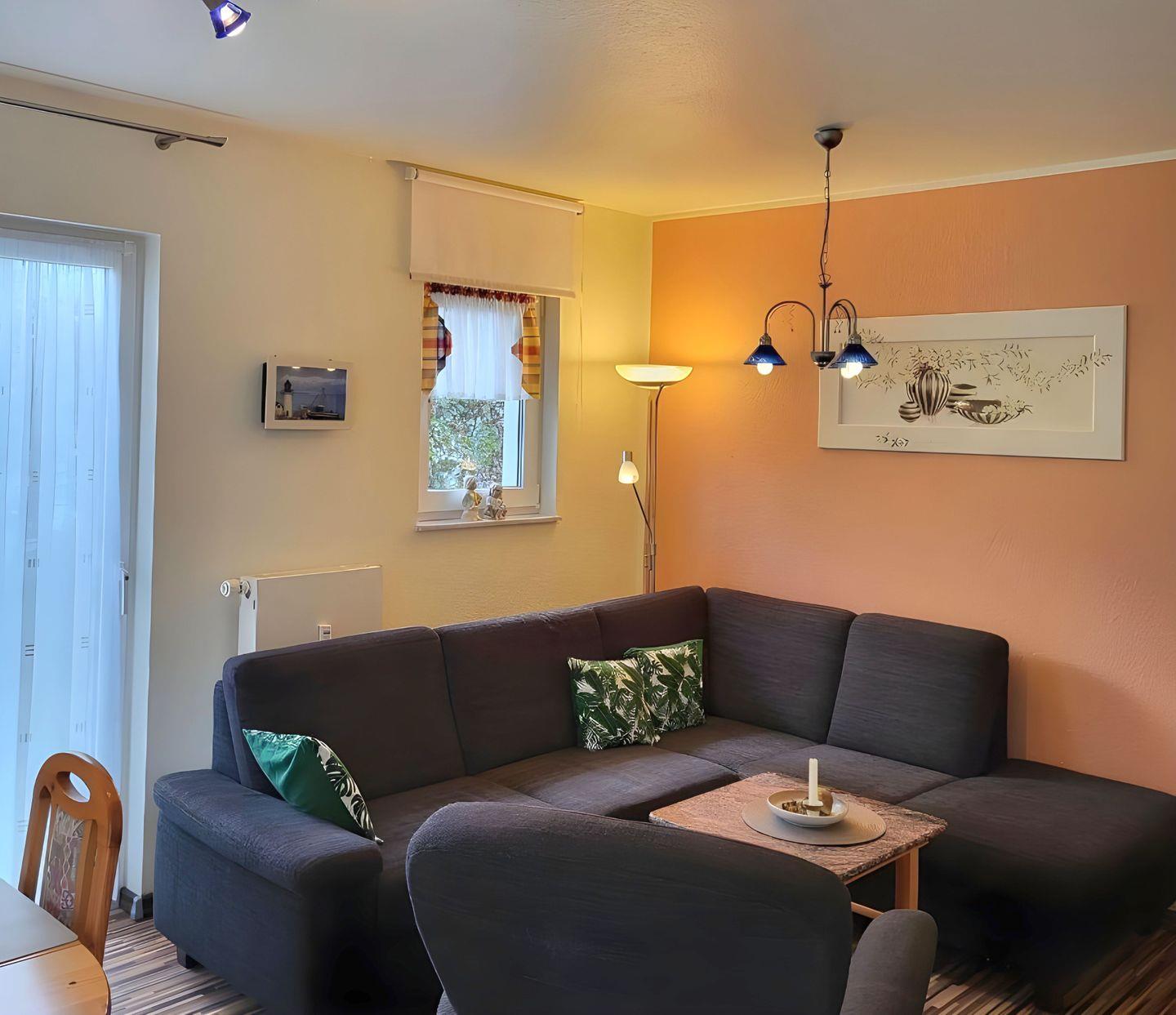 Das Wohnzimmer lädt mit einer gemütlichen Sitzecke zum Verweilen ein und bietet direkten Zugang zur Terrasse sowie zu einem privaten Garten – ideal für entspannte Stunden im Freien.
