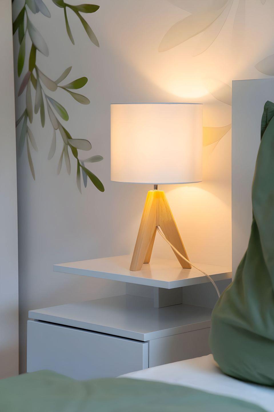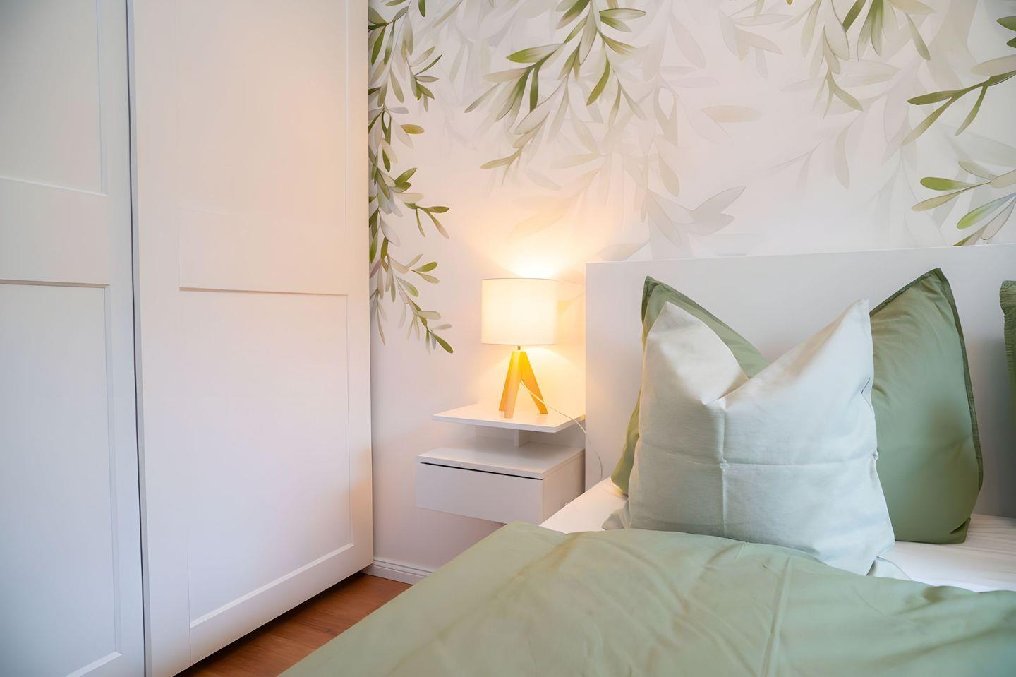 elektrische Sonnenschutzrollos. Neben einem 160x200m Bett im Schlafzimmer steht