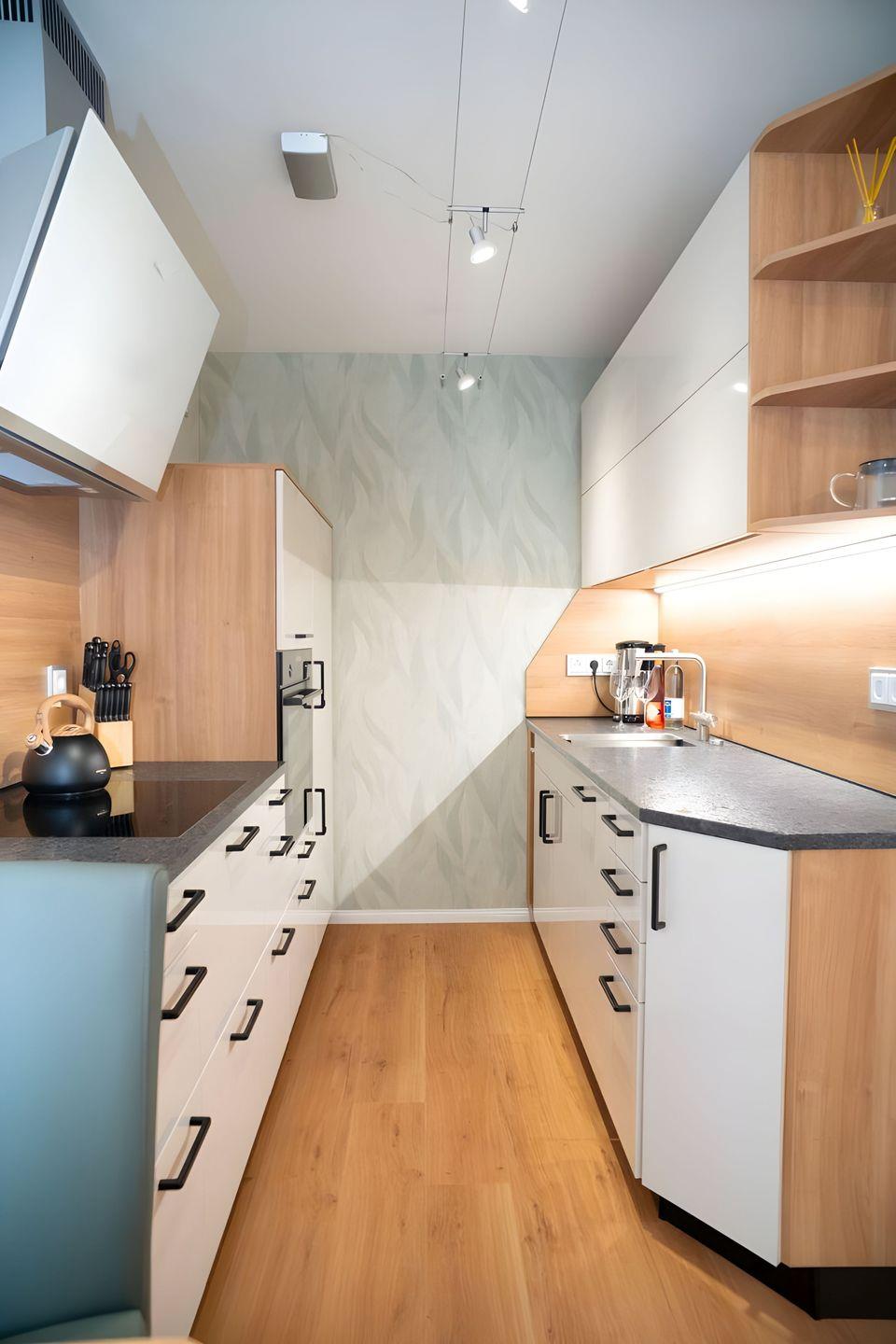 Küchenausstattung (Kühl- und Gefrierkombination, Induktionskochherd, Backofen,