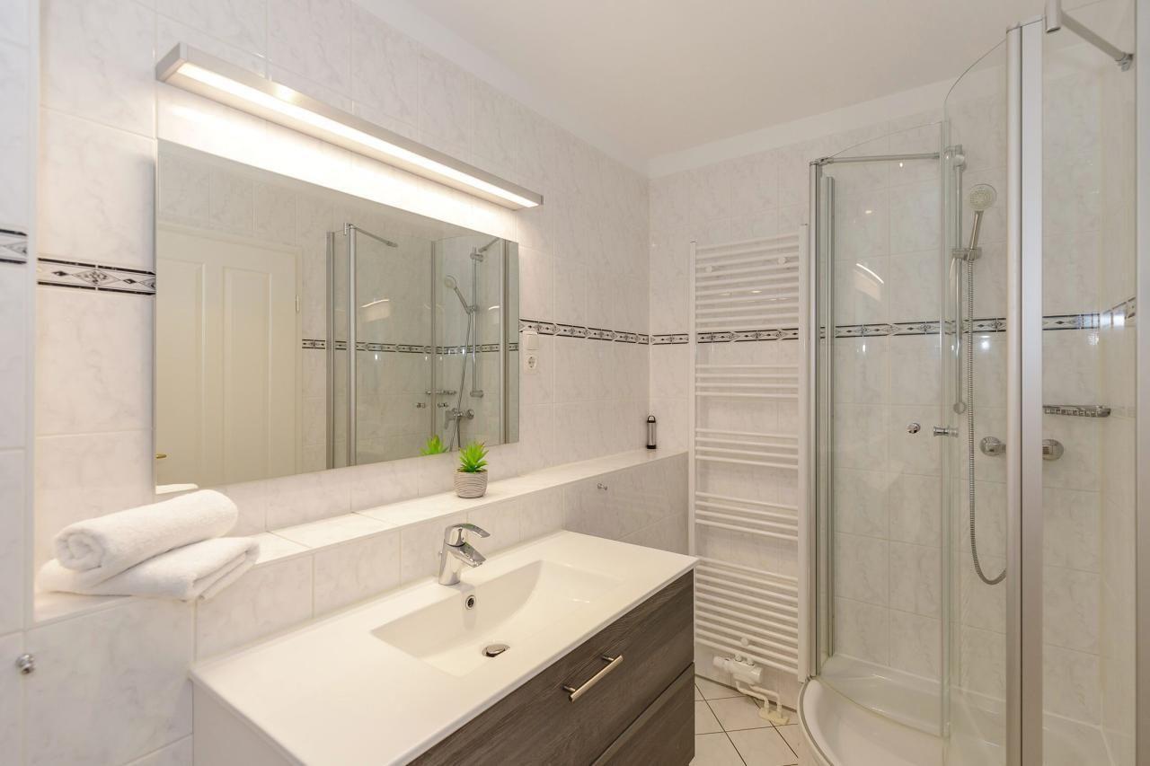 Das moderne Badezimmer bietet alles, was Sie für einen entspannten Start in den Tag brauchen: Dusche, WC, Waschbecken mit großzügigem Unterschrank, Handtuchtrockner und ausreichend Ablageflächen für Ihre Pflegeprodukte.