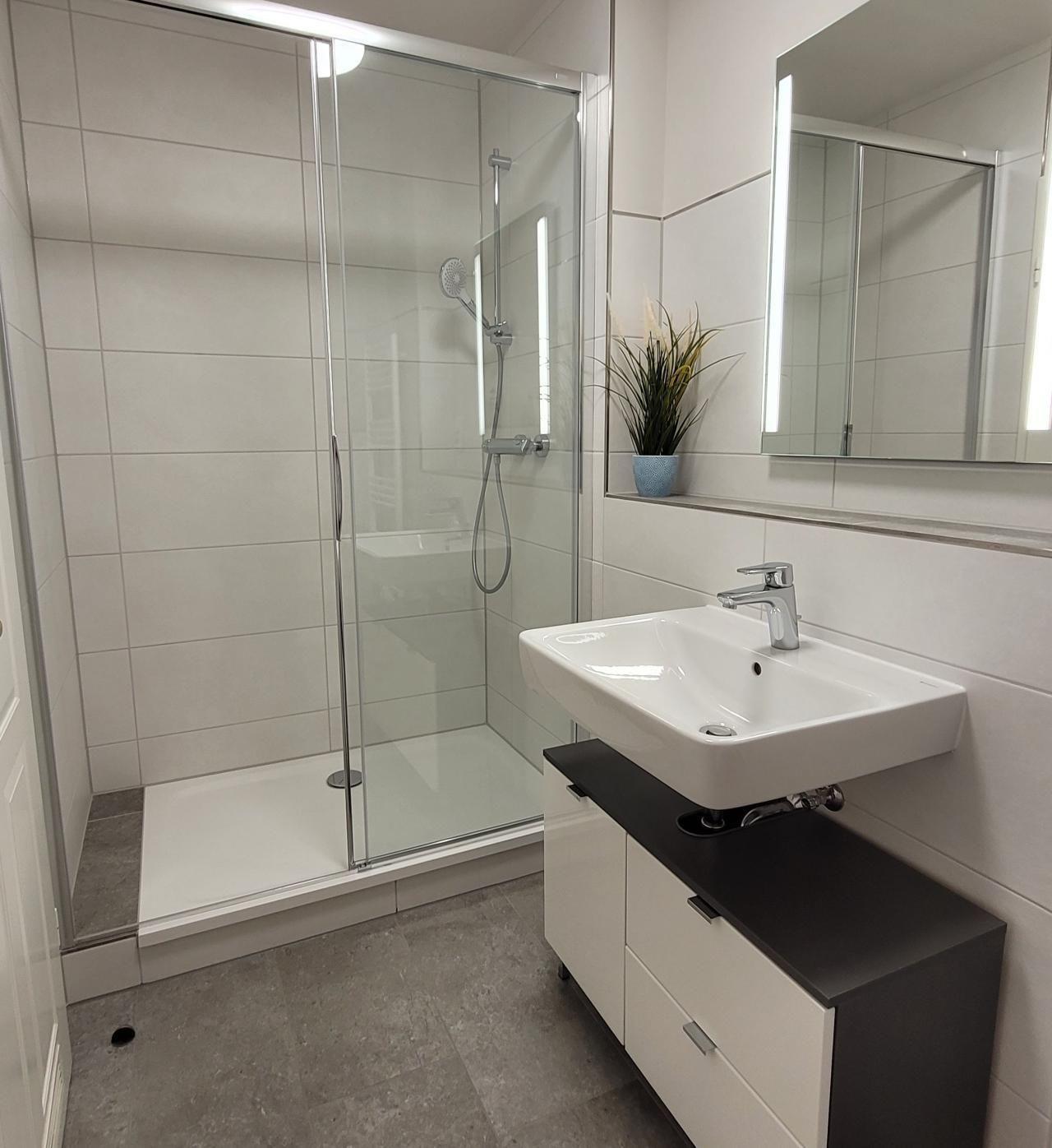 Das moderne Badezimmer bietet alles, was Sie für einen entspannten Start in den Tag brauchen: Dusche, WC, Waschbecken mit großem Unterschrank, Handtuchtrockner und ausreichend Ablageflächen für Ihre Pflegeprodukte.
