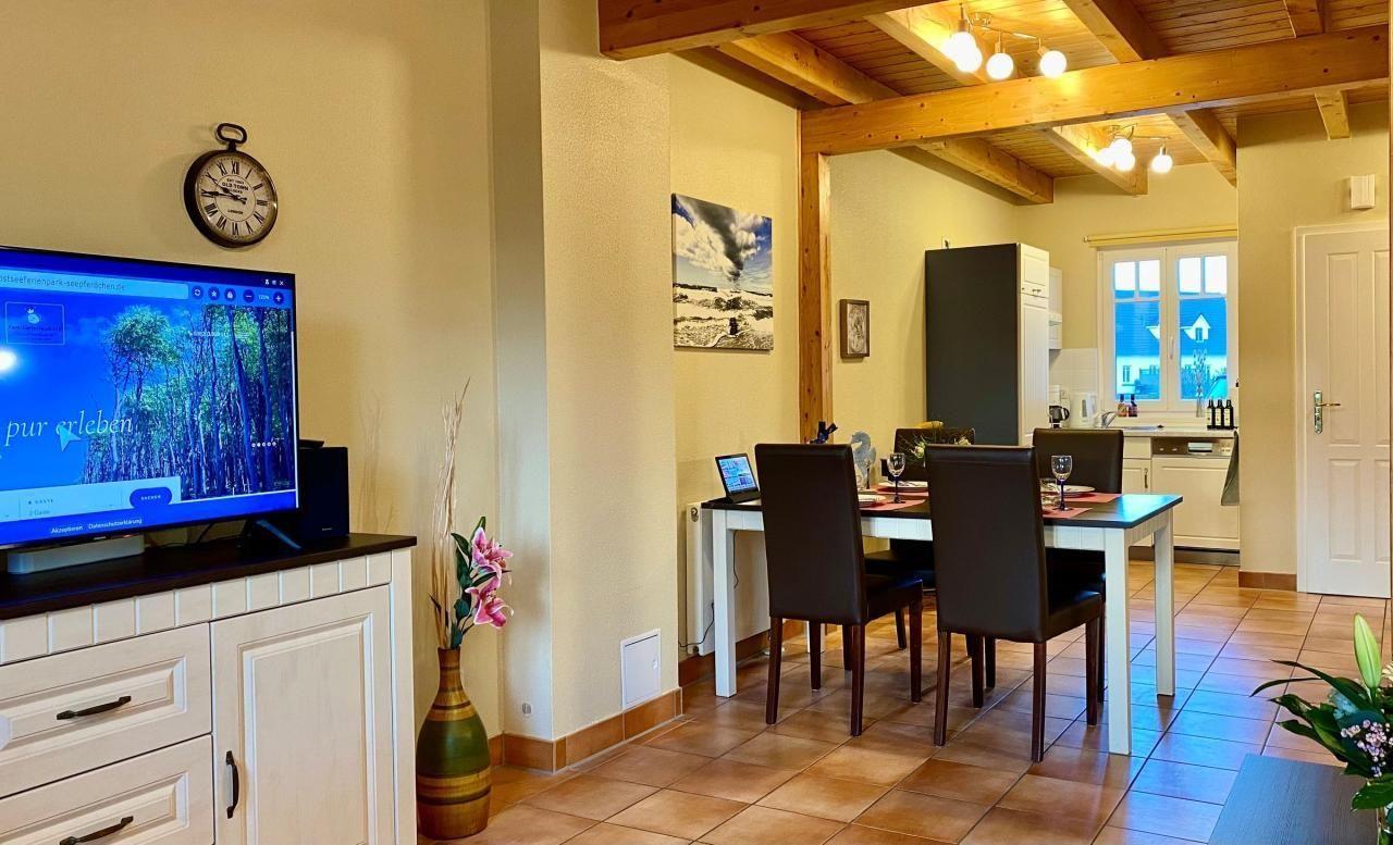Im Erdgeschoss erwartet Sie ein liebevoll gestalteter Wohnbereich mit einem Sessel und einer gemütlichen Couch-Garnitur, die sich bei Bedarf in einen komfortablen Schlafplatz für zwei Personen verwandeln lässt. Warme Farben, stilvolle Dekoration und hochwertige Möbel schaffen eine behagliche Atmosphäre – perfekt für entspannte Abende nach einem erlebnisreichen Tag an der Ostsee.