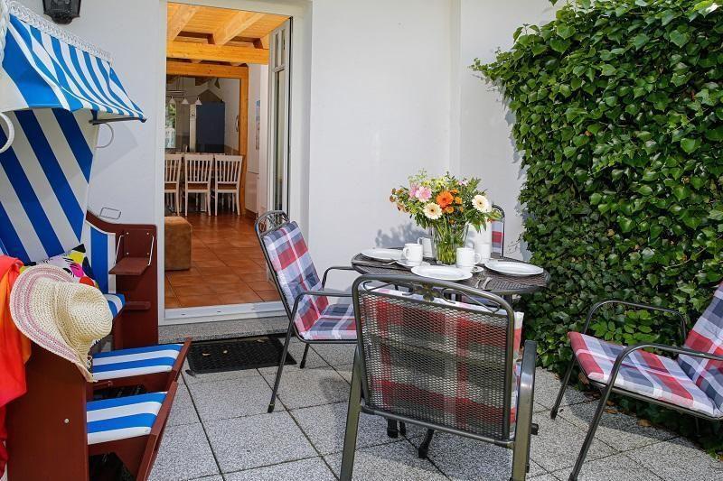 Genießen Sie das Ostsee-Feeling mit der ganzen Familie auf der romantisch anmutenden Terrasse, die Ihnen einen fantastischen freien Blick auf die Ruhe ausstrahlende Umgebung mit weitläufigen Rasenflächen, die das Ferienhaus umfassen, bietet. Moderne Gartenmöbel und ein hübscher Strandkorb laden zum gemütlichen Verweilen ein und vervollständigen das harmonische Ambiente im Außenbereich des Hauses.