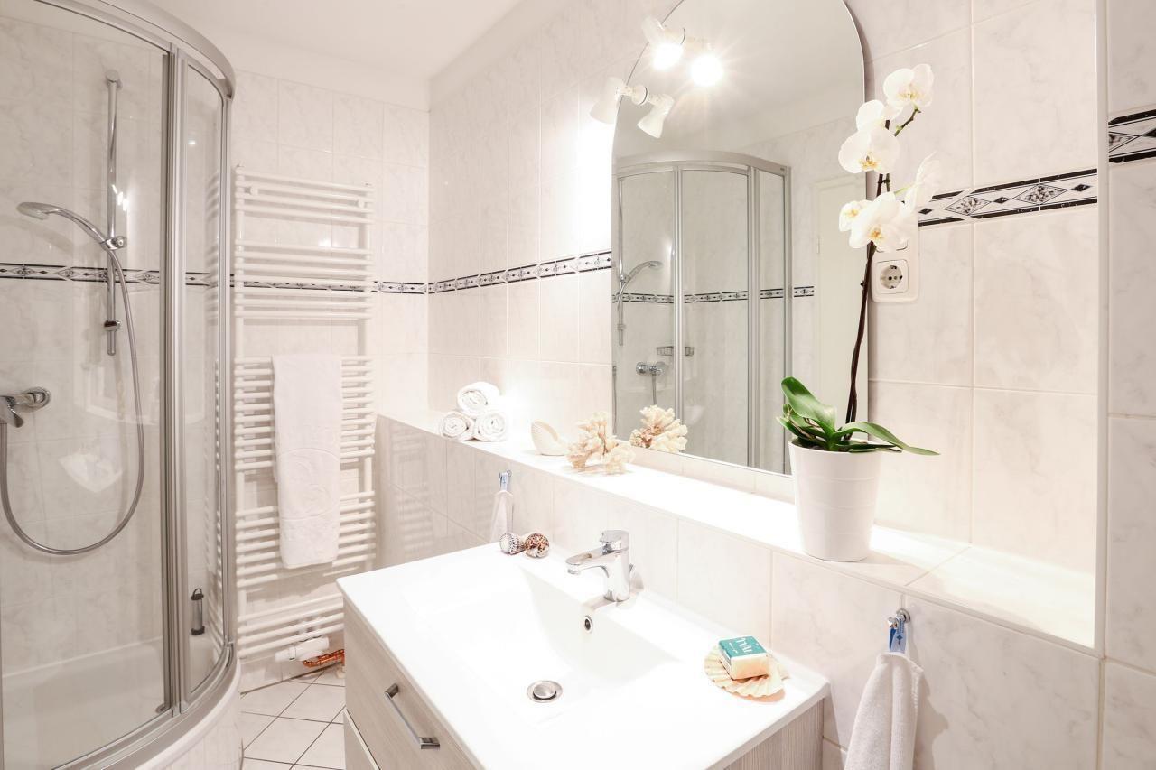 Das moderne Badezimmer bietet alles, was Sie für einen entspannten Start in den Tag brauchen: Dusche, WC, Waschbecken mit großzügigem Unterschrank, Handtuchtrockner und ausreichend Ablageflächen für Ihre Pflegeprodukte.